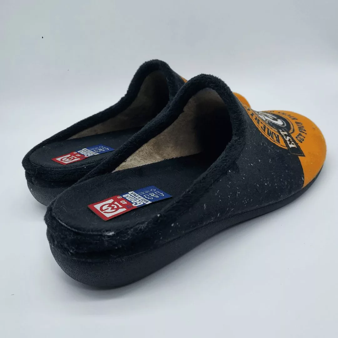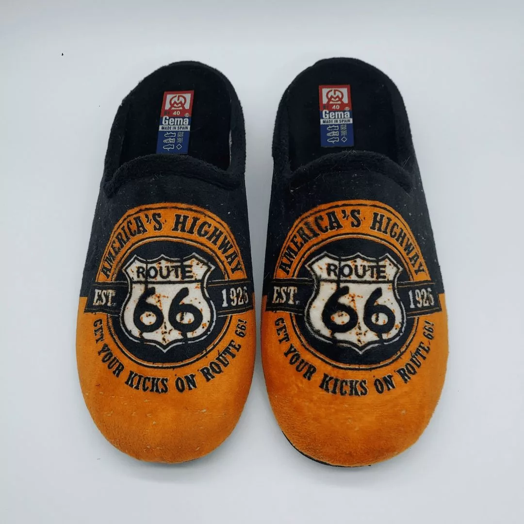 Gema García Mod. 7005-19, Zapatilla Plana Abierta acabado color Naranja con estampado «Route 66», Forro Interior Suave, Ribete de Pelo y Plantilla Acolchada Extraible. Suela de Caucho. Hechas en España.