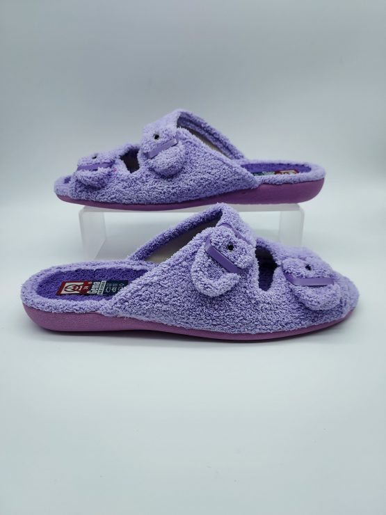 Gema García Mod. 7804-3, Zapatilla de verano con Cuña Baja, acabado Rizo Swin color Lila Claro/Malva, con 2 hebillas para su mejor ajuste, suelo vulcanizado. Hecha en España. Envío, Devolución y Reembolso