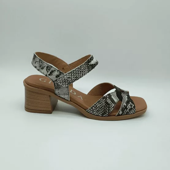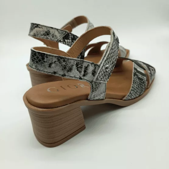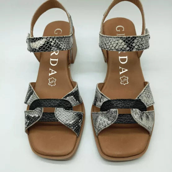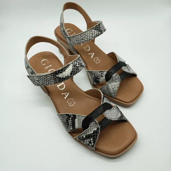 Giorda Mod. 54166, Sandalia en Piel acabado Serpiente combinado con Negro, Tacón Grueso de 5 cm., Plantilla Acolchada en Piel, Cierre tipo Pulsera mediante Velcro en Tobillo. Hecha en España.