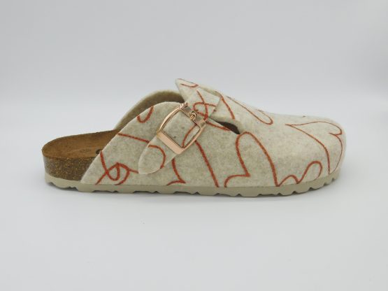 Gobbs Mod. 520039, Zapatilla de Invierno para Señora con Plantilla Bio, Tejido Fieltro Lana, acabado Crudo con Corazones, detalle lateral hebilla dorada. Envío, Devolución y Reembolso