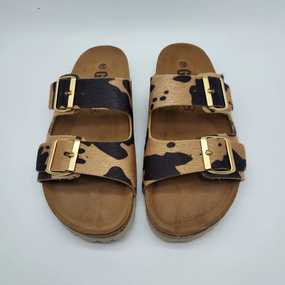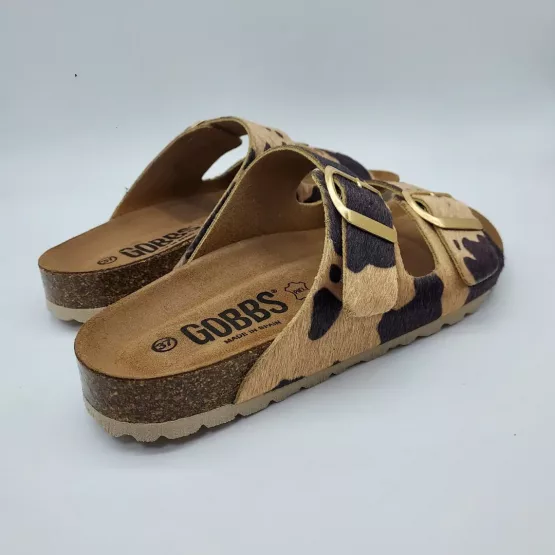 Gobbs Mod. 523015, Sandalia Plana tipo BIO fabricada en material sintético, acabado Cow Fur color Beig, con Cierre de Hebillas Ajustables (2). Plantilla Piel combinada con Textil. Hecha en España.