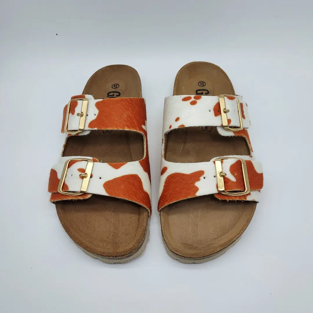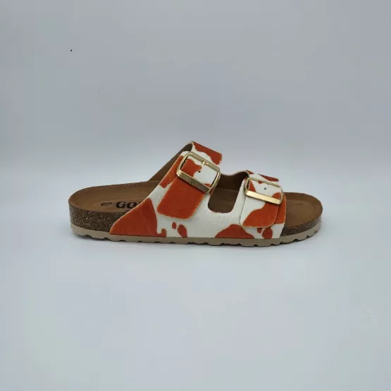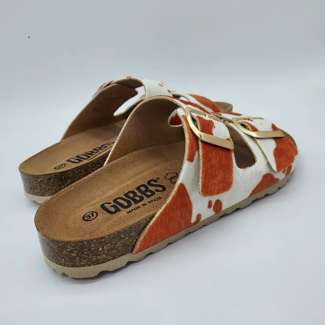 Gobbs Mod. 523015, Sandalia Plana tipo BIO fabricada en material sintético, acabado Cow Fur color Crudo-Camel, con Cierre de Hebillas Ajustables (2). Plantilla Piel combinada con Textil. Hecha en España.