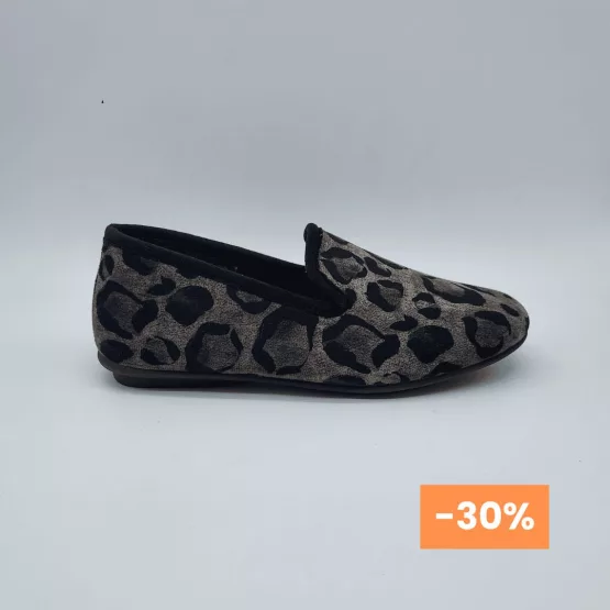 Hannibal Laguna Mod. Bath 06, Zapatillas de Casa Cerradas tipo Chinelas, fabricadas en Textil de color Negro con Print y Ribete Efecto Pelo al tono, con Forro y Plantilla color Fucsia. Hechas en España.