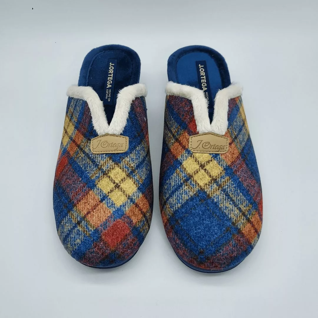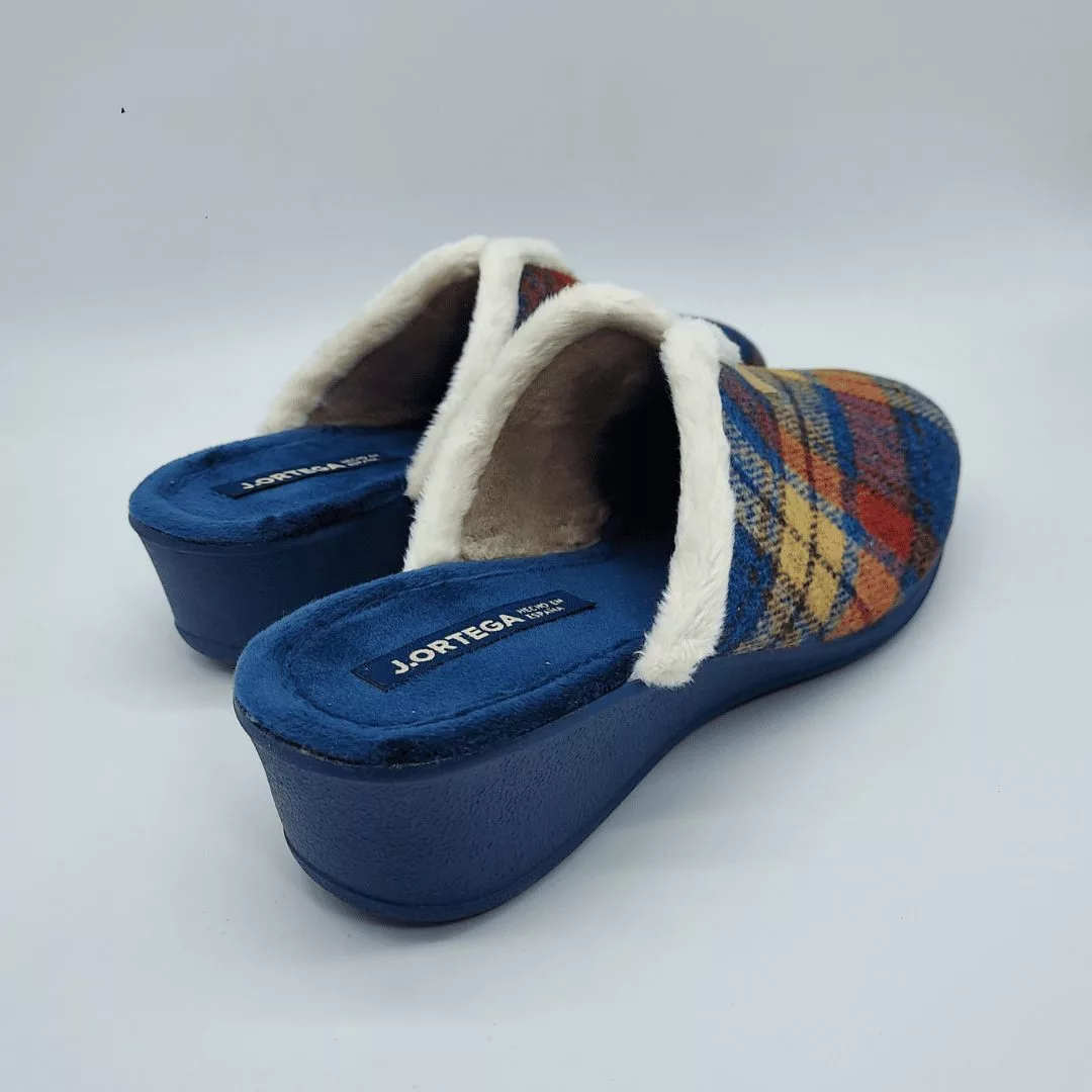 J. Ortega Mod. 1803, Zapatillas de Punta Cerrada con Cuña de 3,5 cm. de altura en Textil Estampado de Cuadros, Fondo Azul, Borde con Apertura Central con Pelo. Suela de Caucho. Hechas en España.