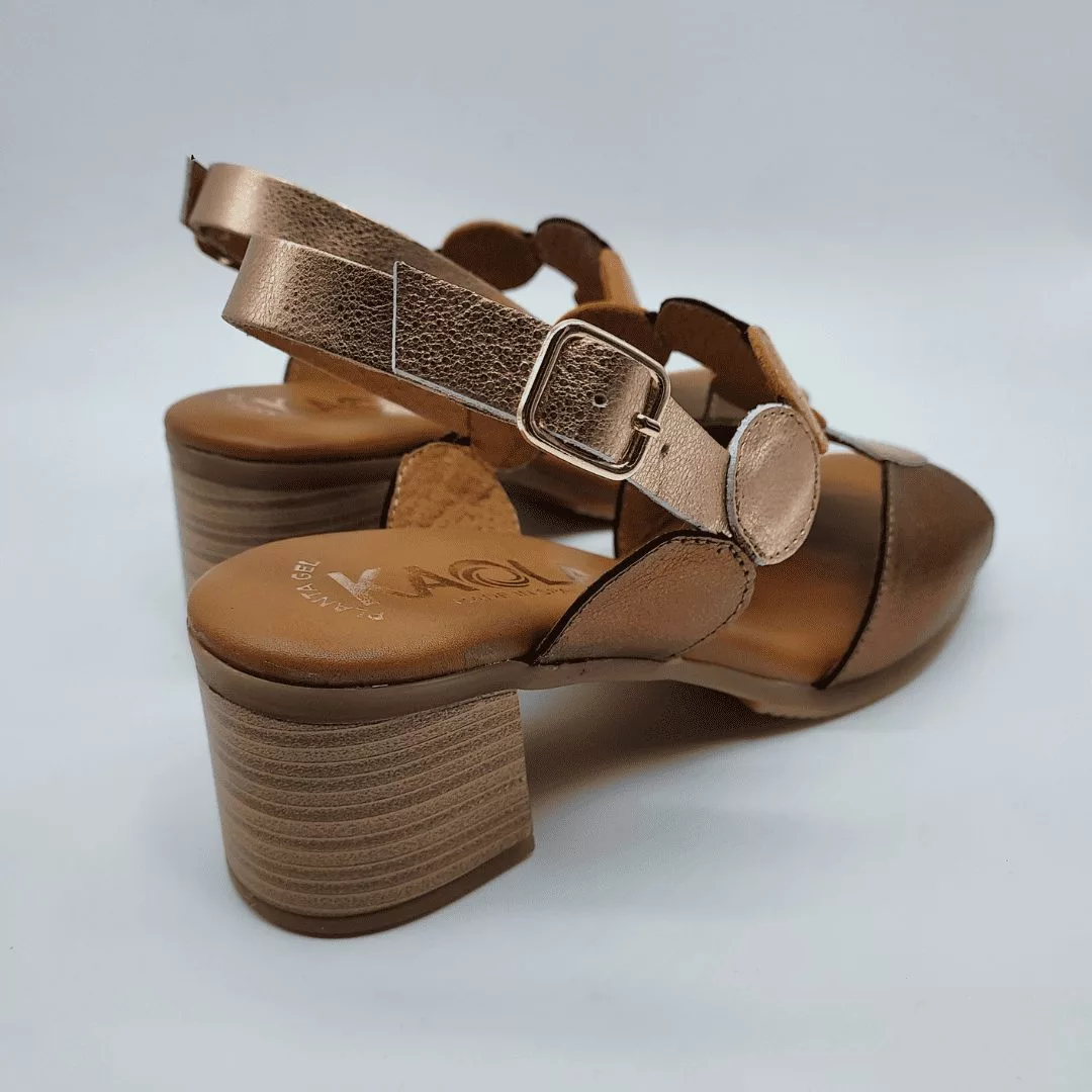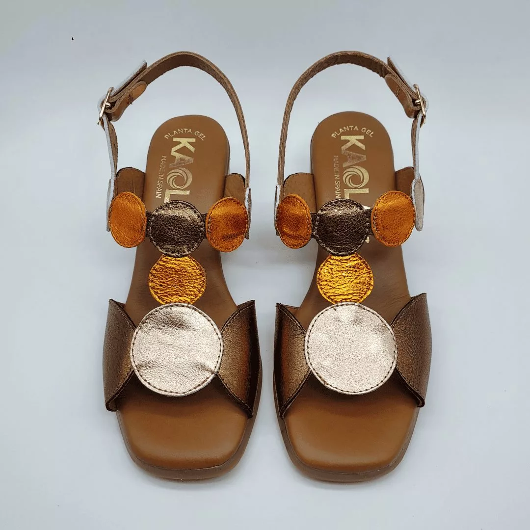 Kaola Mod. 1995, Sandalia en Piel de formas geométricas acabado color Bronce combinado con otros colores Metalizados (Rose y Naranja), Tacón Grueso de 4,5 cm., cierre mediante Hebilla en Tobillo, con Plantilla de Gel. Fabricada en España.