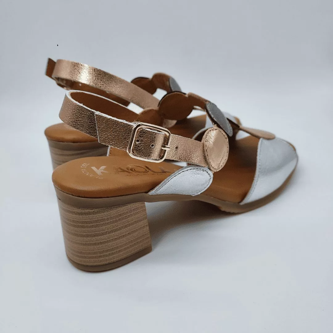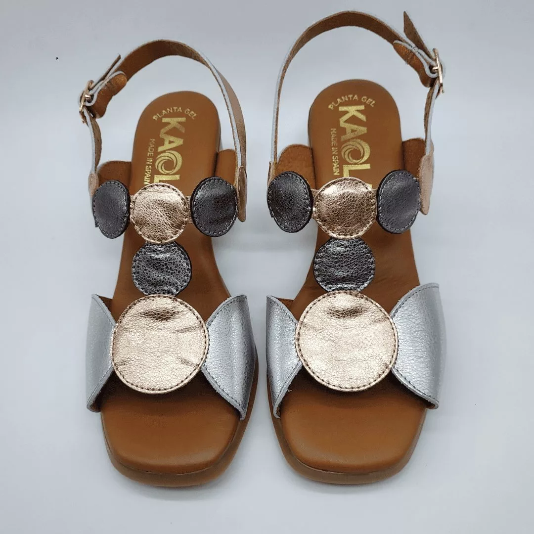 Kaola Mod. 1995, Sandalia en Piel de formas geométricas acabado color Plata combinado con otros colores Metalizados (Platino y Acero), Tacón Grueso de 4,5 cm., cierre mediante Hebilla en Tobillo, con Plantilla de Gel. Fabricada en España.