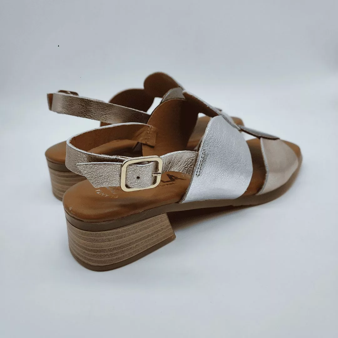 Kaola Mod. 2684, Sandalia en Piel de formas geométricas acabado color Plata combinado con otros colores Metalizados, Tacón Grueso de 3,5 cm., cierre mediante Hebilla en Tobillo, con Plantilla de Gel. Fabricada en España.