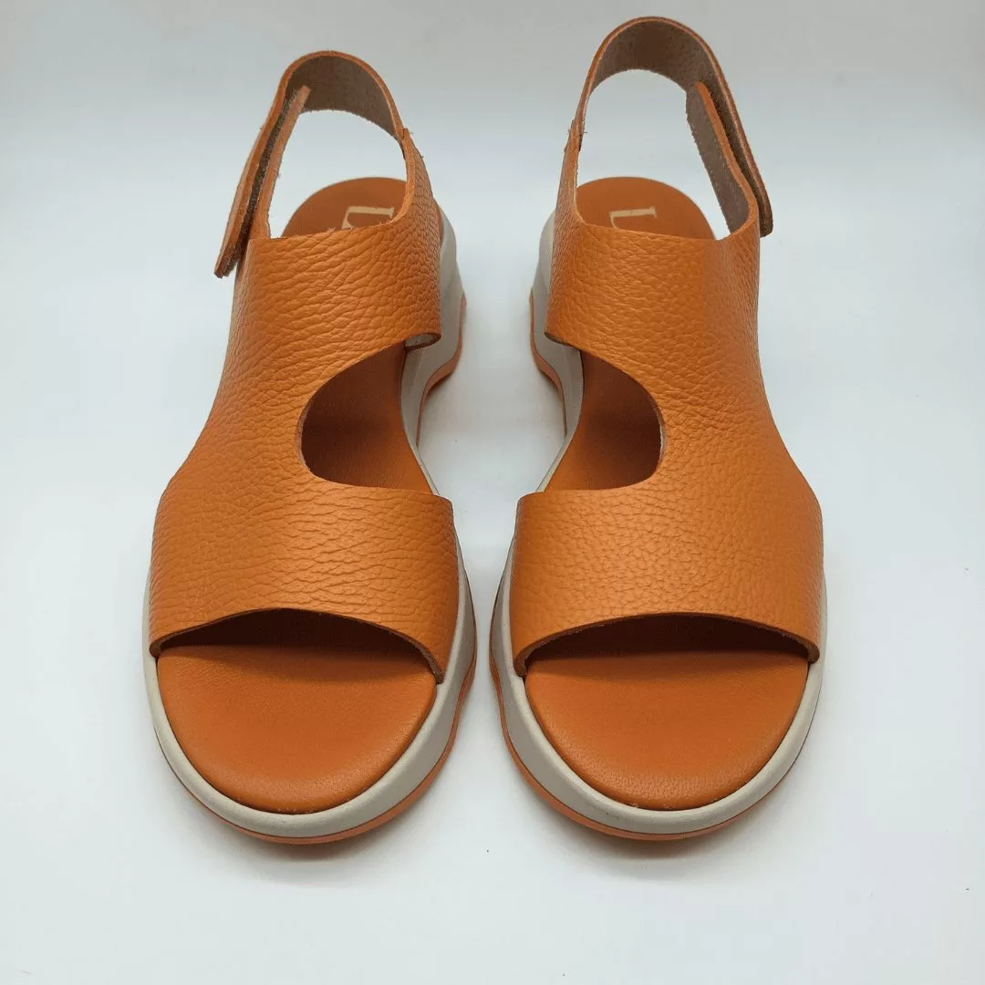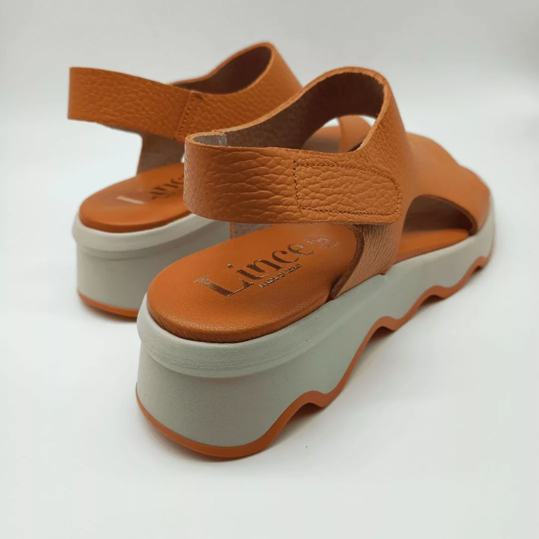 Lince Mod. 50255, Sandalia en Piel acabado color Naranja, Suela Ondulada color Beige y Naranja. Plantilla Acolchada de Piel, Cierre adaptable al tobillo mediante velcro. Hecha en España.