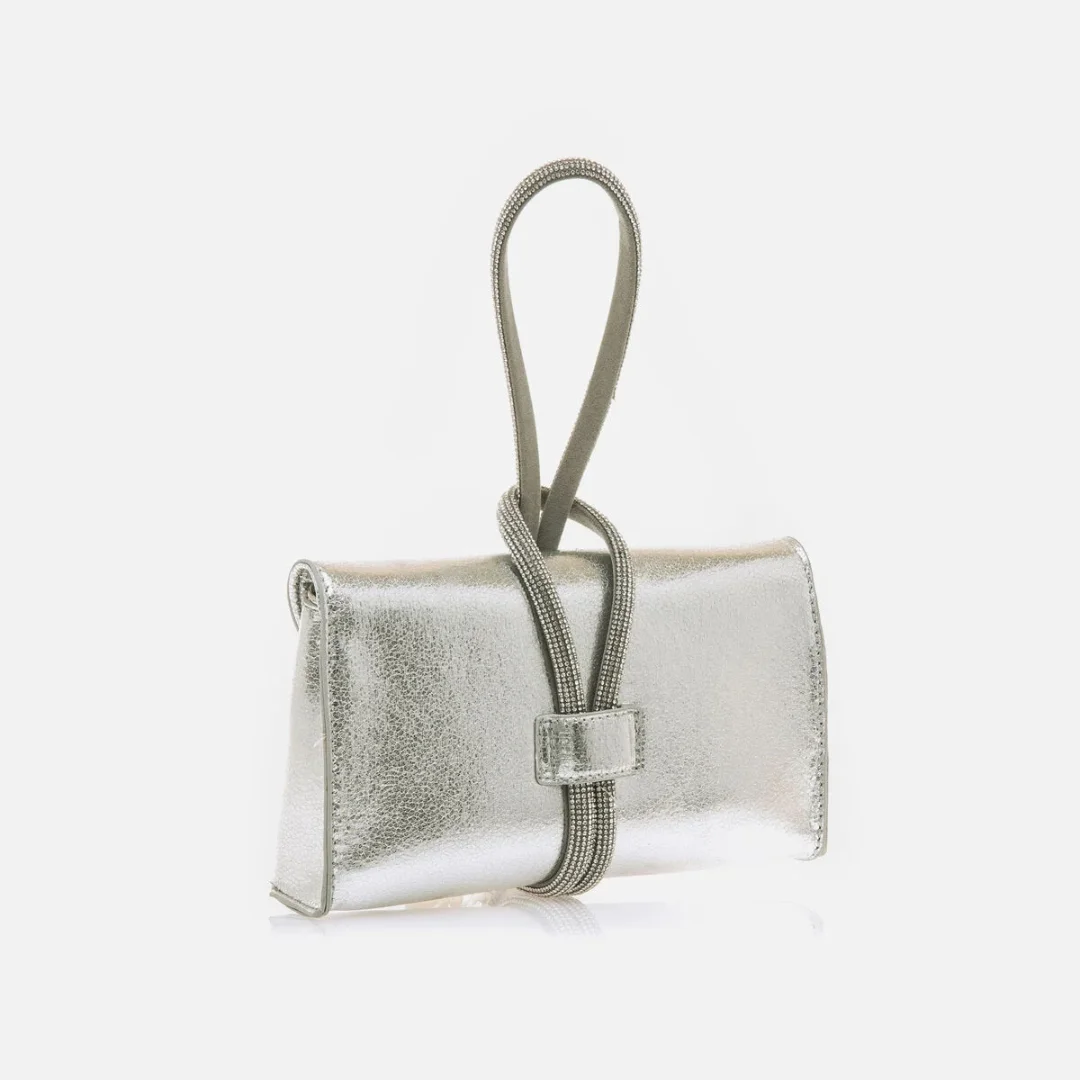 Mariamare Mod. C59747, Bolso tipo Clutch para Mujer acabado Roun color Plata, fabricado en materiales sintéticos y textiles, diseño compacto con acabado plateado y asa decorativa con tiras finas y brillantes plateados que se cruzan al frente. Incluye cadena plateada desmontable para llevar al hombro o cruzado. Cierre con botón magnético.