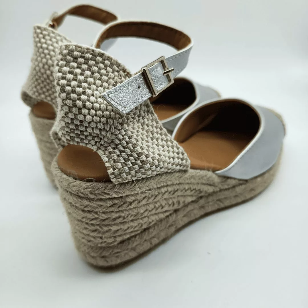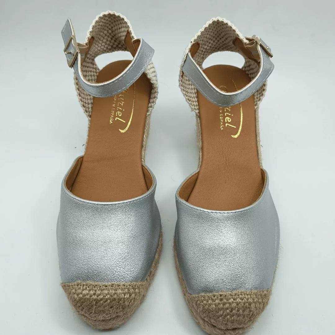 Mariel Mod. 15157-C, Sandalia en Cuña de Yute con 5 cuerdas y 7 cm. de altura, Pala en Napa acabado Metalizado Plata, Talonera en tela y Cierre mediante Hebilla con Cinta de Cuero del mismo tono al Tobillo. Hecha en España.