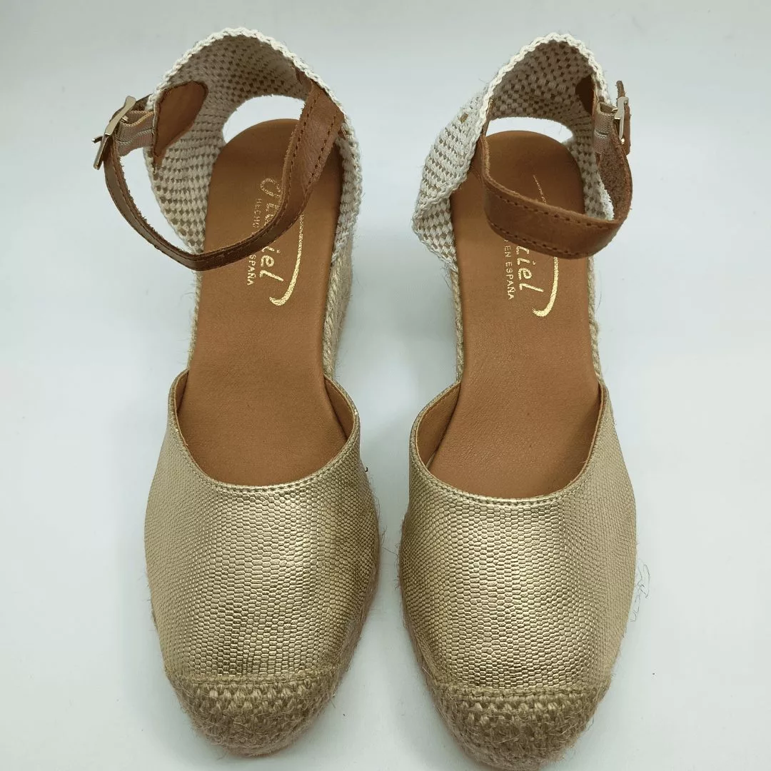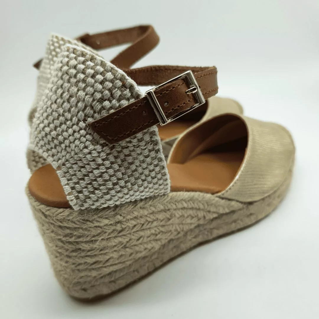 Mariel Mod. 15160-C, Sandalia en Cuña de Yute con 5 cuerdas y 7 cm. de altura, Pala en Tejido Textil acabado Deltor Platino, Talonera en tela y Cierre mediante Hebilla con Cinta de Cuero al tobillo. Hecha en España.