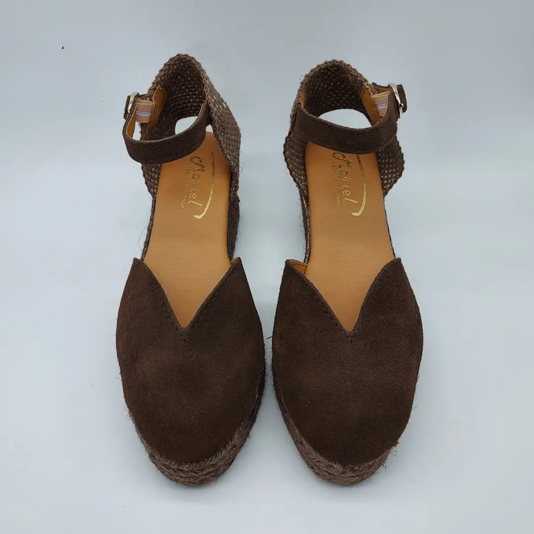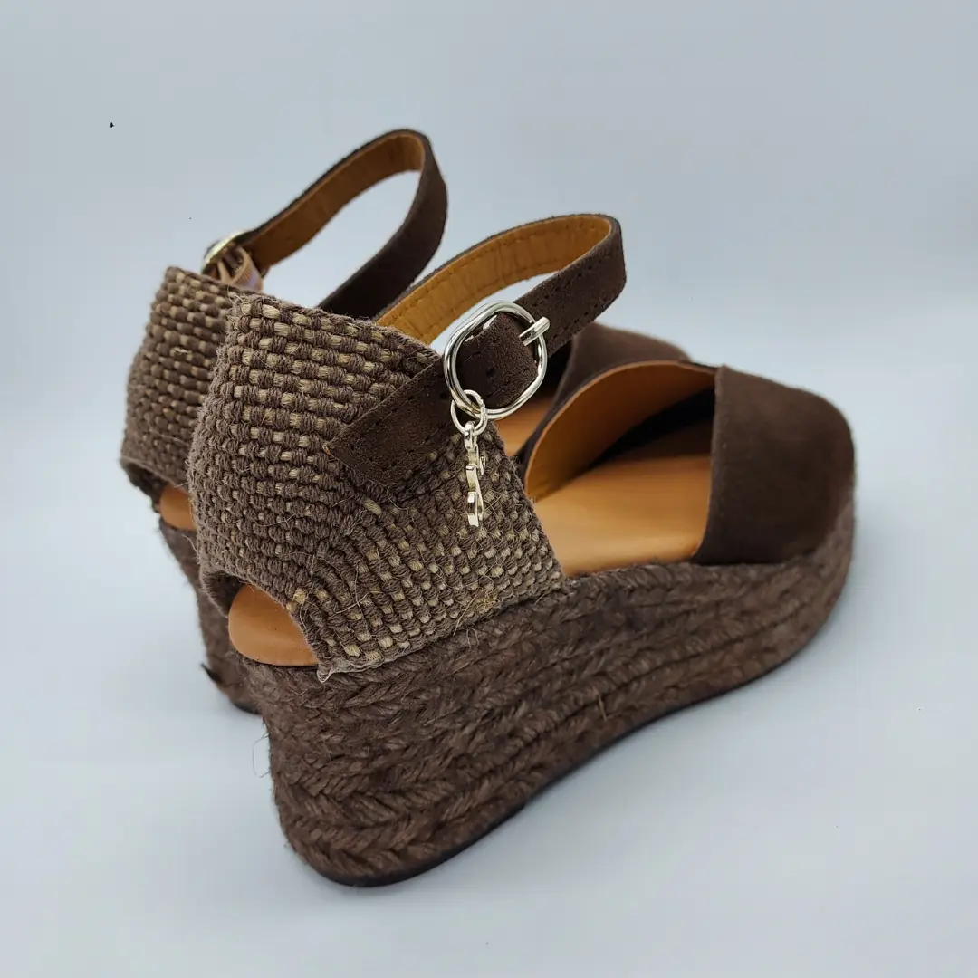 Mariel Mod. 23319X, Sandalia en Cuña de Yute con 3 cuerdas y 7 cm. de altura en Cuña y 3 cm. en delantera, Pala en Piel Serraje acabado color Marrón, Talonera en tela y Cierre mediante Hebilla con Cinta de Cuero al Tobillo y detalle metálico de la marca. Hecha en España.