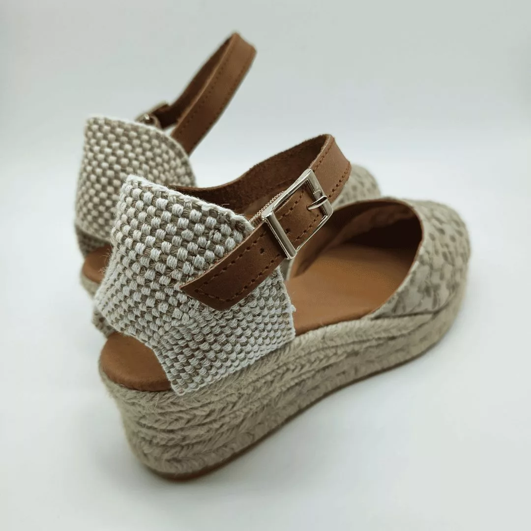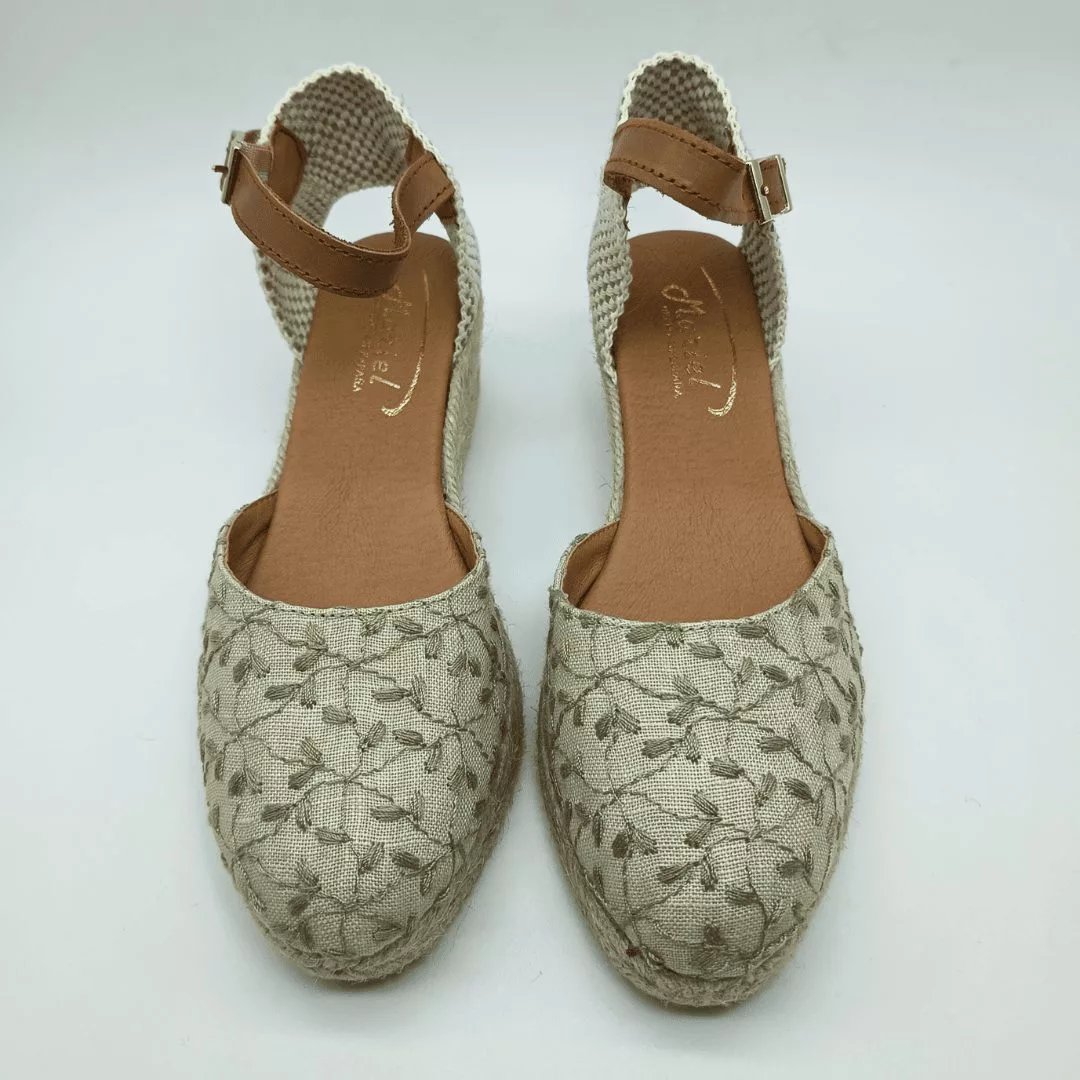 Mariel Mod. 3161, Sandalia en Cuña de Yute con 3 cuerdas y 5 cm. de altura, Pala en Textil Bordado acabado Sicario Beig, Talonera en tela y Cierre mediante Hebilla con Cinta de Cuero al Tobillo. Hecha en España.
