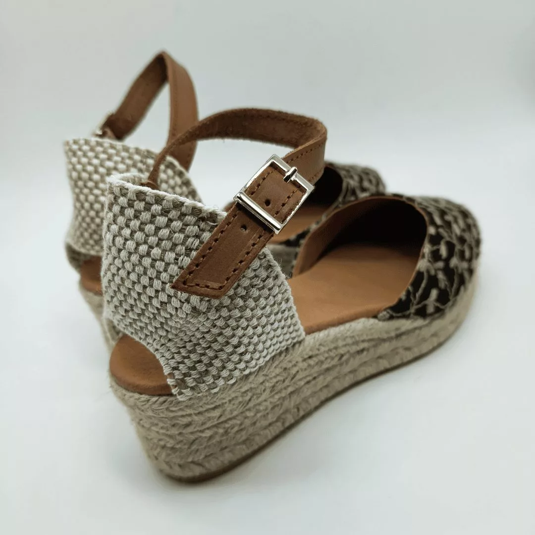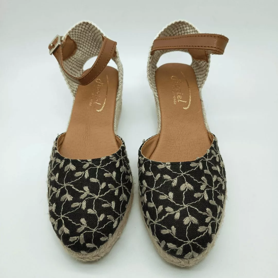 Mariel Mod. 3161, Sandalia en Cuña de Yute con 3 cuerdas y 5 cm. de altura, Pala en Textil Bordado acabado Sicario Negro, Talonera en tela y Cierre mediante Hebilla con Cinta de Cuero al Tobillo. Hecha en España.