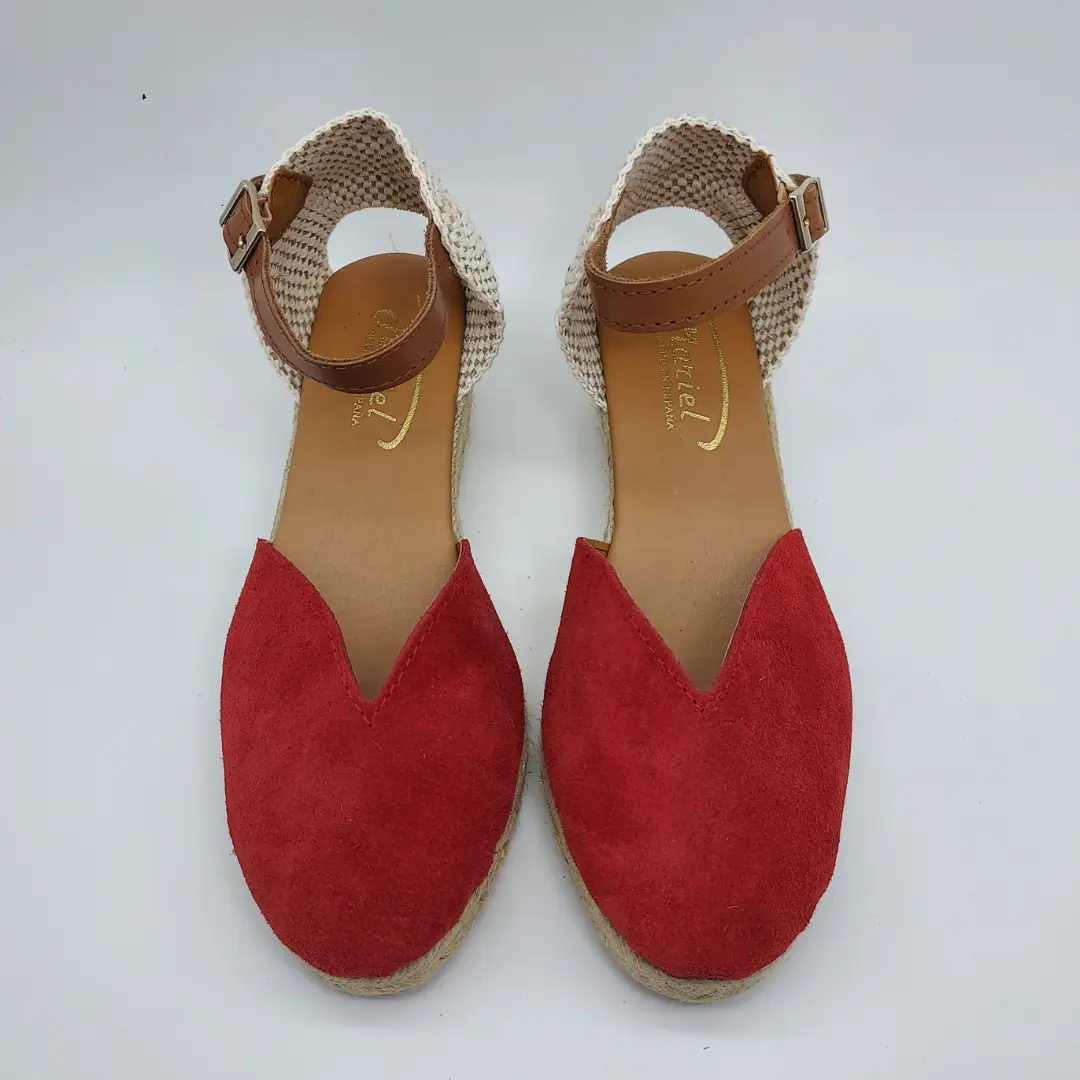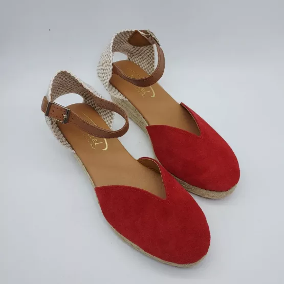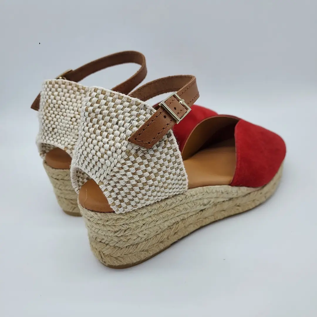 Mariel Mod. 3359, Sandalia en Cuña de Yute con 3 cuerdas y 5 cm. de altura, Pala en Serraje acabado color Fuego con abertura central, Talonera en tela y Cierre mediante Hebilla con Cinta de Cuero al Tobillo. Hecha en España.