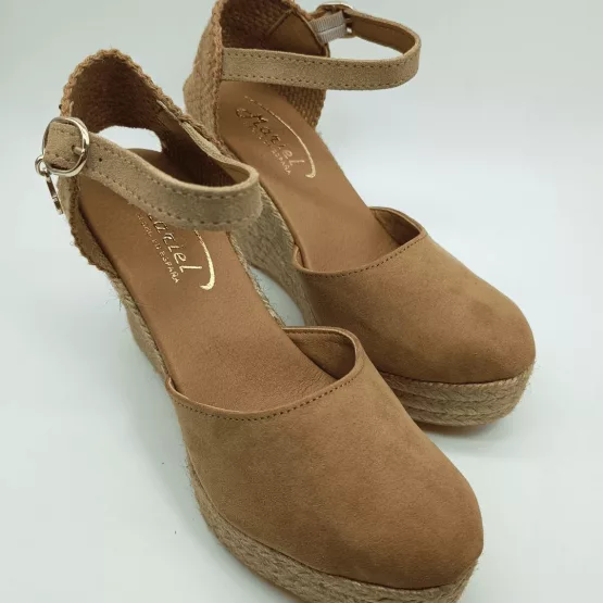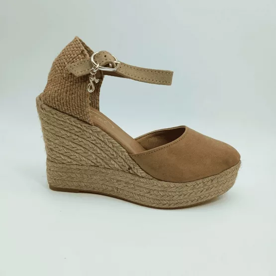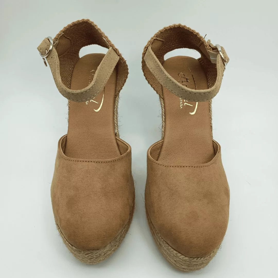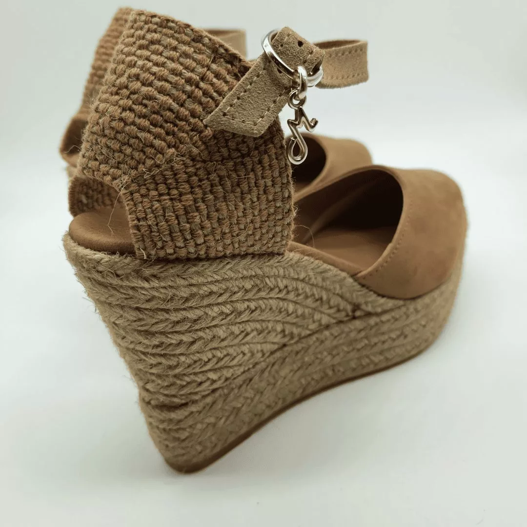 Mariel Mod. 37158X, Sandalia en Cuña de Yute con 7 cuerdas y 10 cm. de altura en Cuña y 3 cm. en delantera, Pala en Textil acabado Ultrasuede Tierra, Talonera en tela y Cierre mediante Hebilla con Cinta de Cuero al Tobillo con detalle metálico de la marca. Hecha en España.