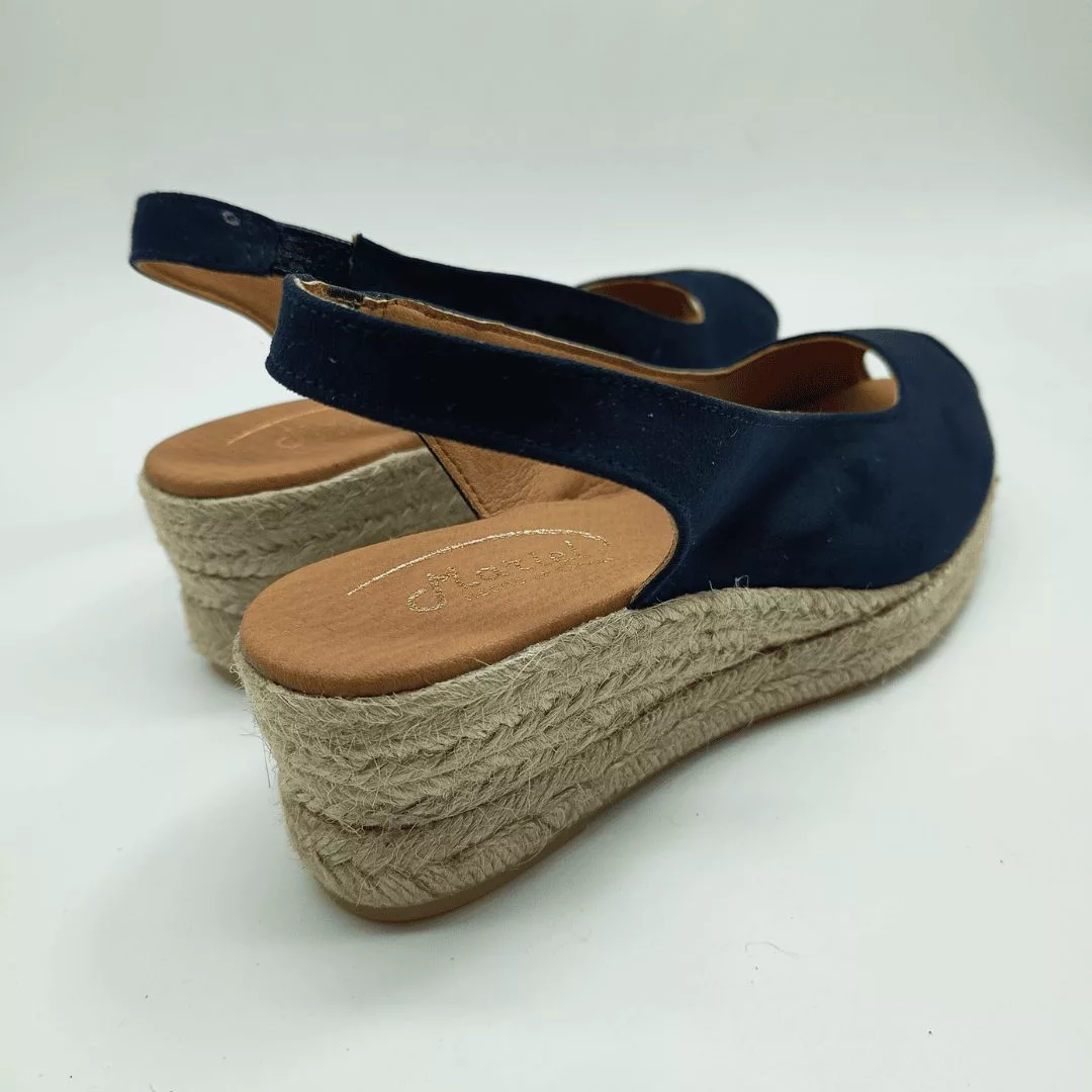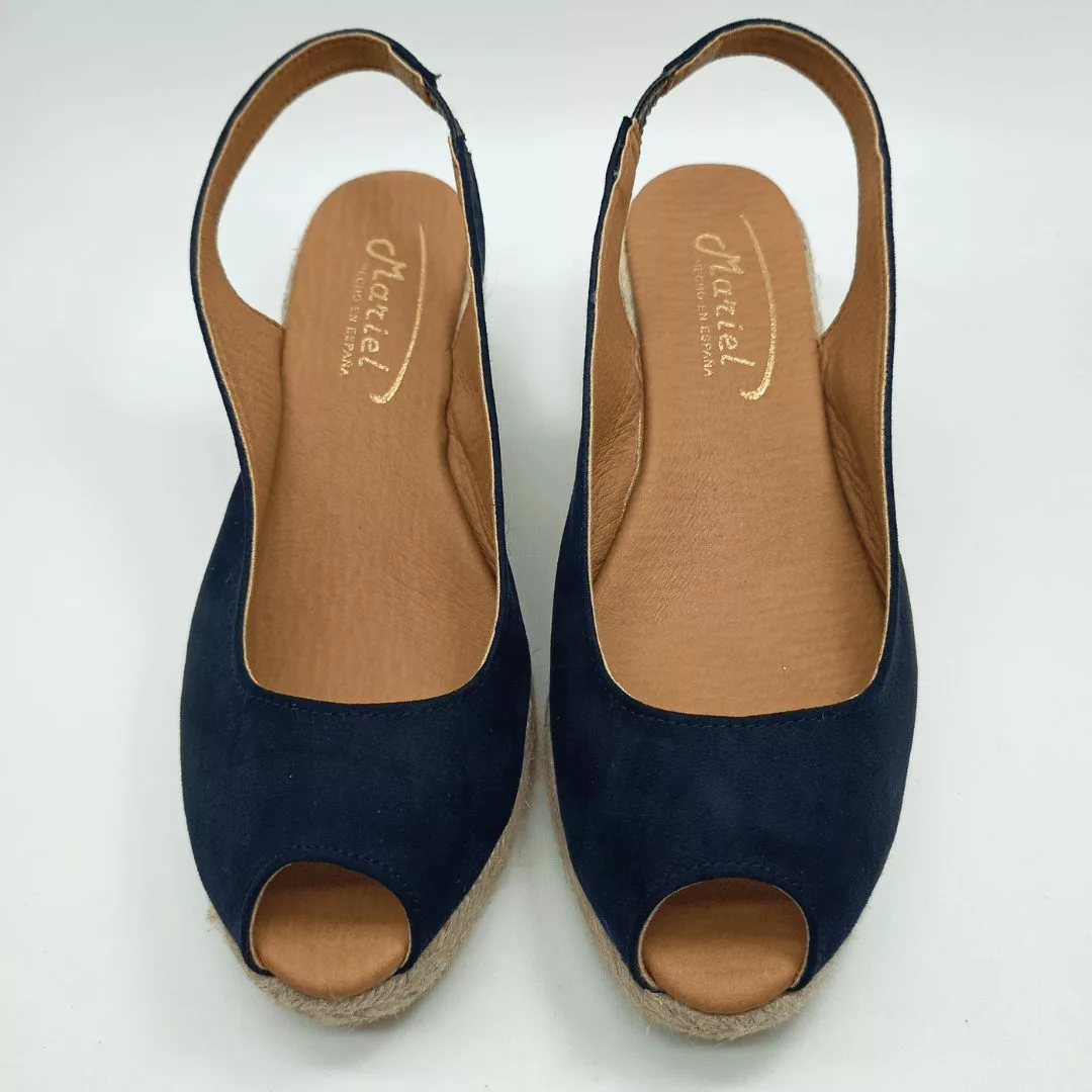 Mariel Mod. 3908, Sandalia en Cuña de Yute con 3 cuerdas y 5 cm. de altura, Pala en Textil acabado Ultrasuede color Marino, con Puntera Abierta y Cierre mediante Tira elástica lateral para un ajuste perfecto. Hecha en España.
