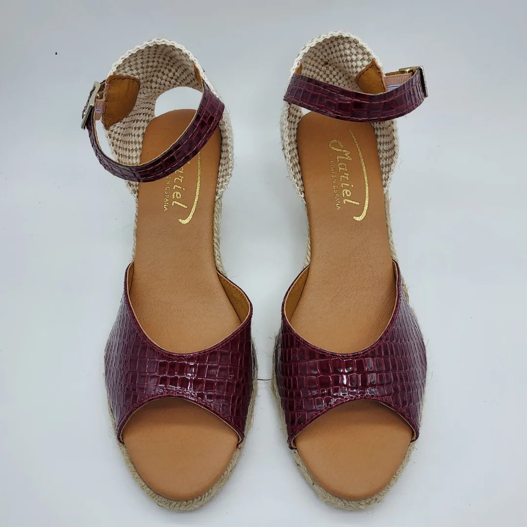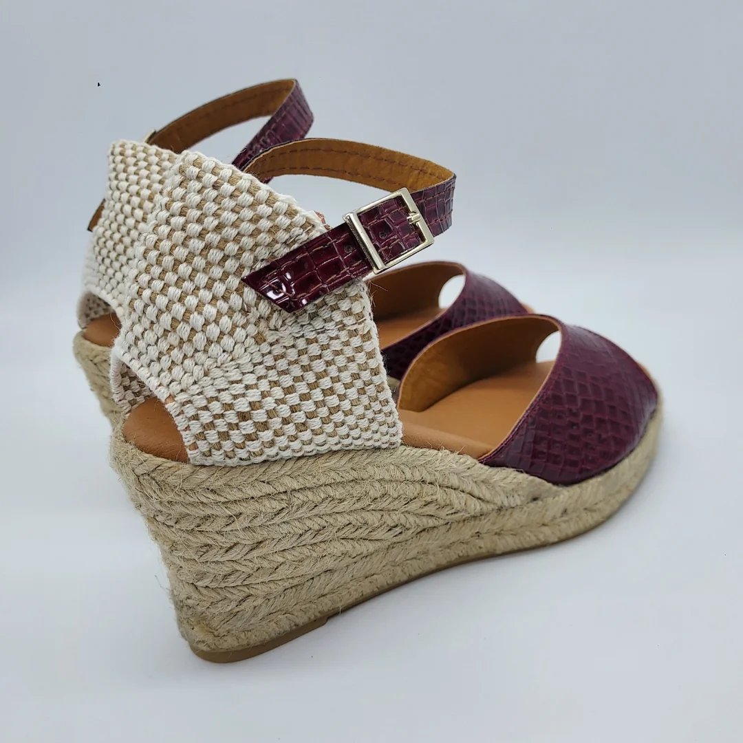 Mariel Mod. 5810, Sandalia en Cuña de Yute con 5 cuerdas y 7 cm. de altura, Pala en Textil Grabado acabado Narnia color Granate, Talonera en tela y Cierre mediante Hebilla con Cinta de Cuero al Tobillo. Puntera Abierta. Hecha en España.