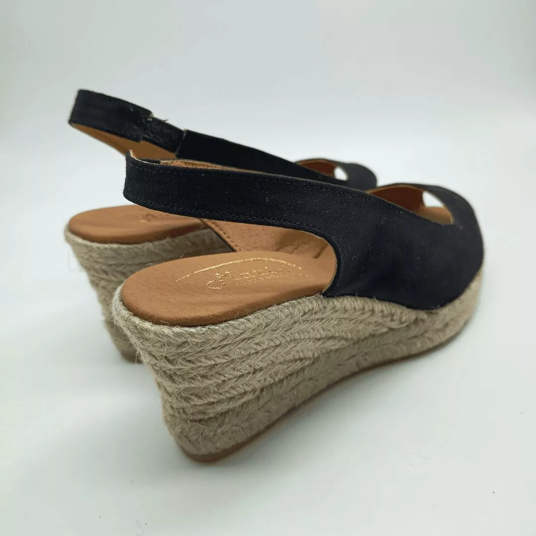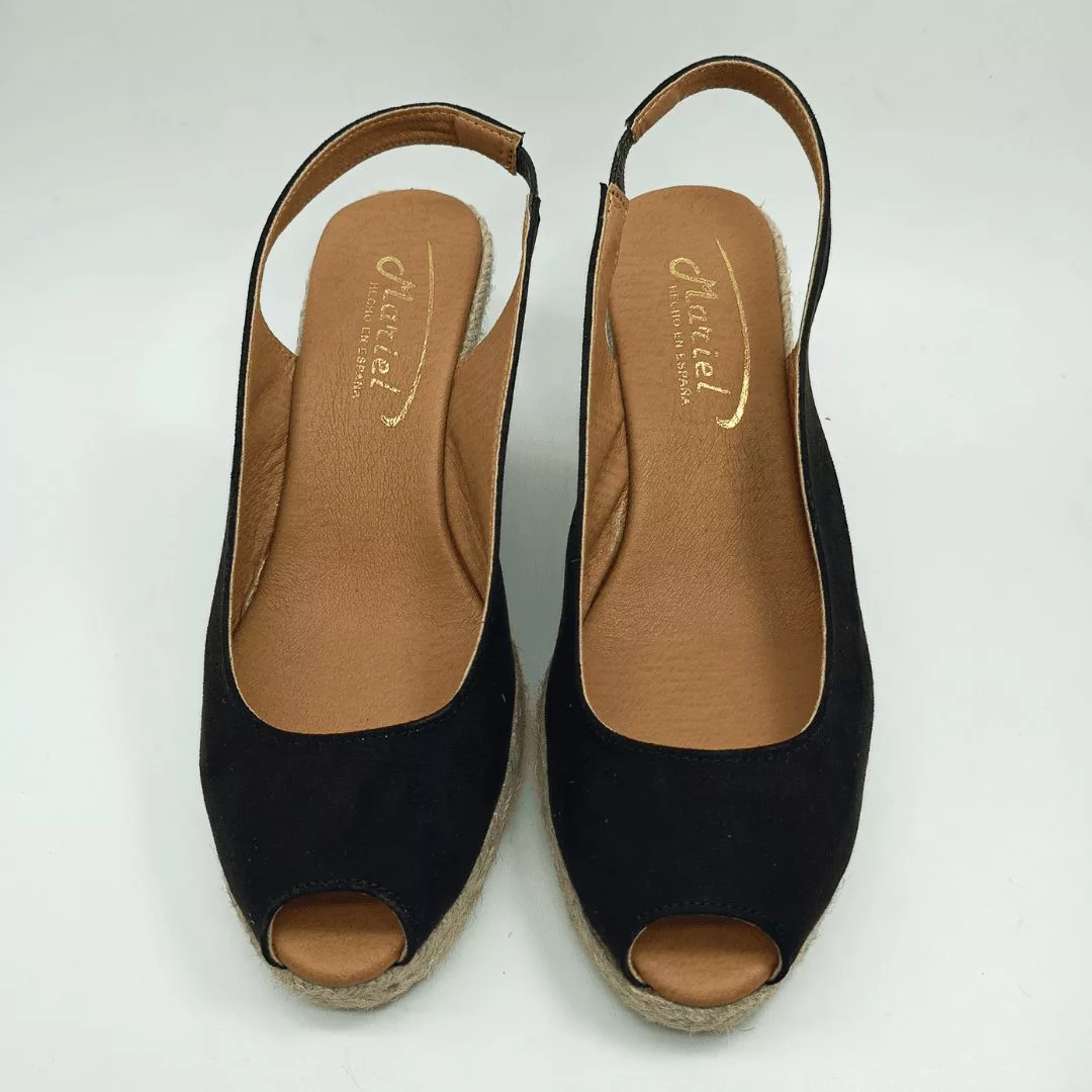 Mariel Mod. 5908, Sandalia en Cuña de Yute con 5 cuerdas y 7 cm. de altura, Pala en Textil acabado Ultrasuede color Negro, con Puntera Abierta y Cierre mediante Tira elástica lateral para un ajuste perfecto. Hecha en España.