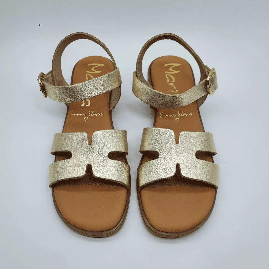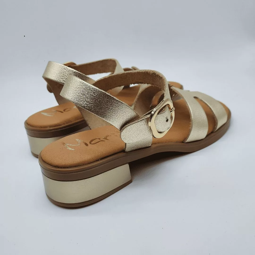 Marila Mod. Oka Grain, Sandalia en Piel acabado color Champan, Plantilla Plantisoft Acolchada, Cierra ajustable mediante Hebilla, Tacón Bajo de 3,5 cm. Hecha en España.