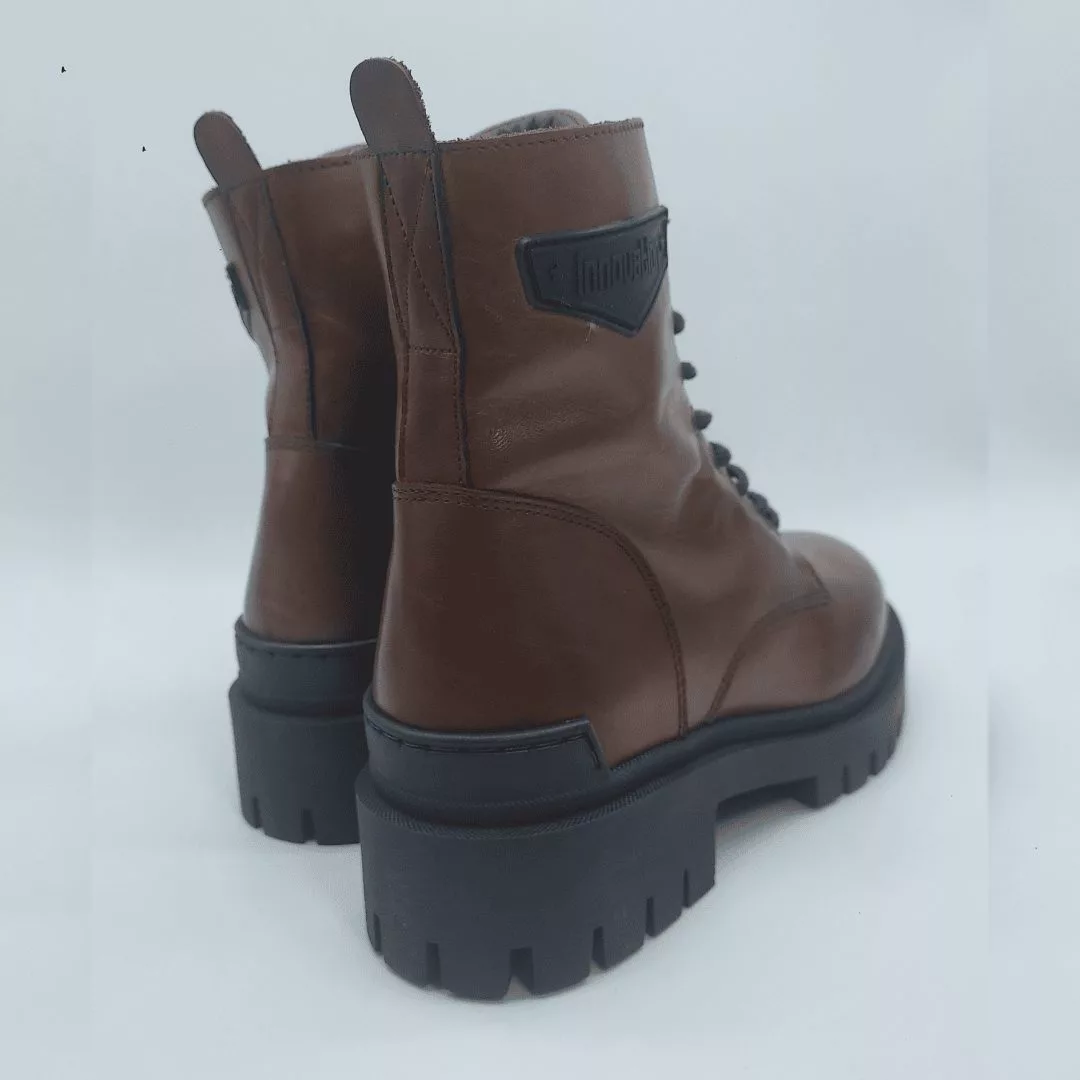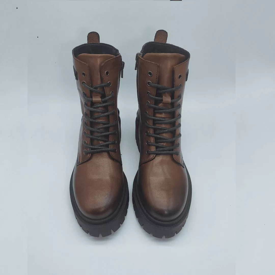 Mesquita Shoes Mod. 5060, Botín estilo Militar para Mujer en Piel, Acabado color Cognac. Planta Acolchada en Piel. Cierre mediante Cordones con Cremallera Lateral para facilitar su puesta. Altura Tacón 4 cm. y Plataforma 2 cm. Hecho en Portugal.