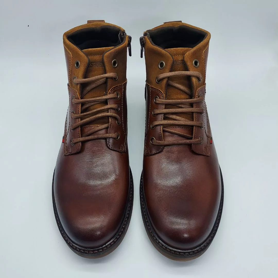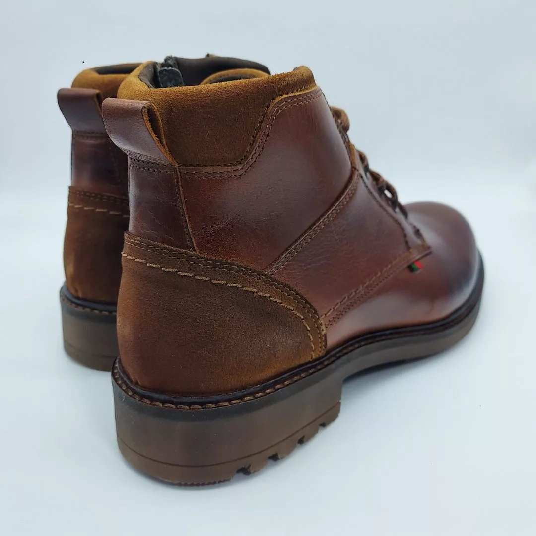 Mesquita Shoes Mod. 770, Botín Deportivo para Hombre en Piel Acabado color Cognac, Cierre mediante Cordones Redondos al tono y Cremallera Lateral para facilitar su puesta. Interior Textil. Planta Acolchada en Piel. Hecho en Portugal.