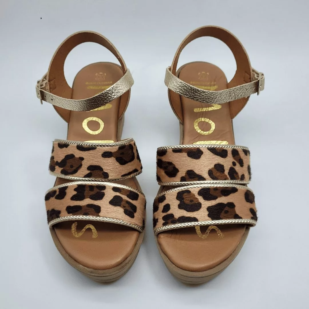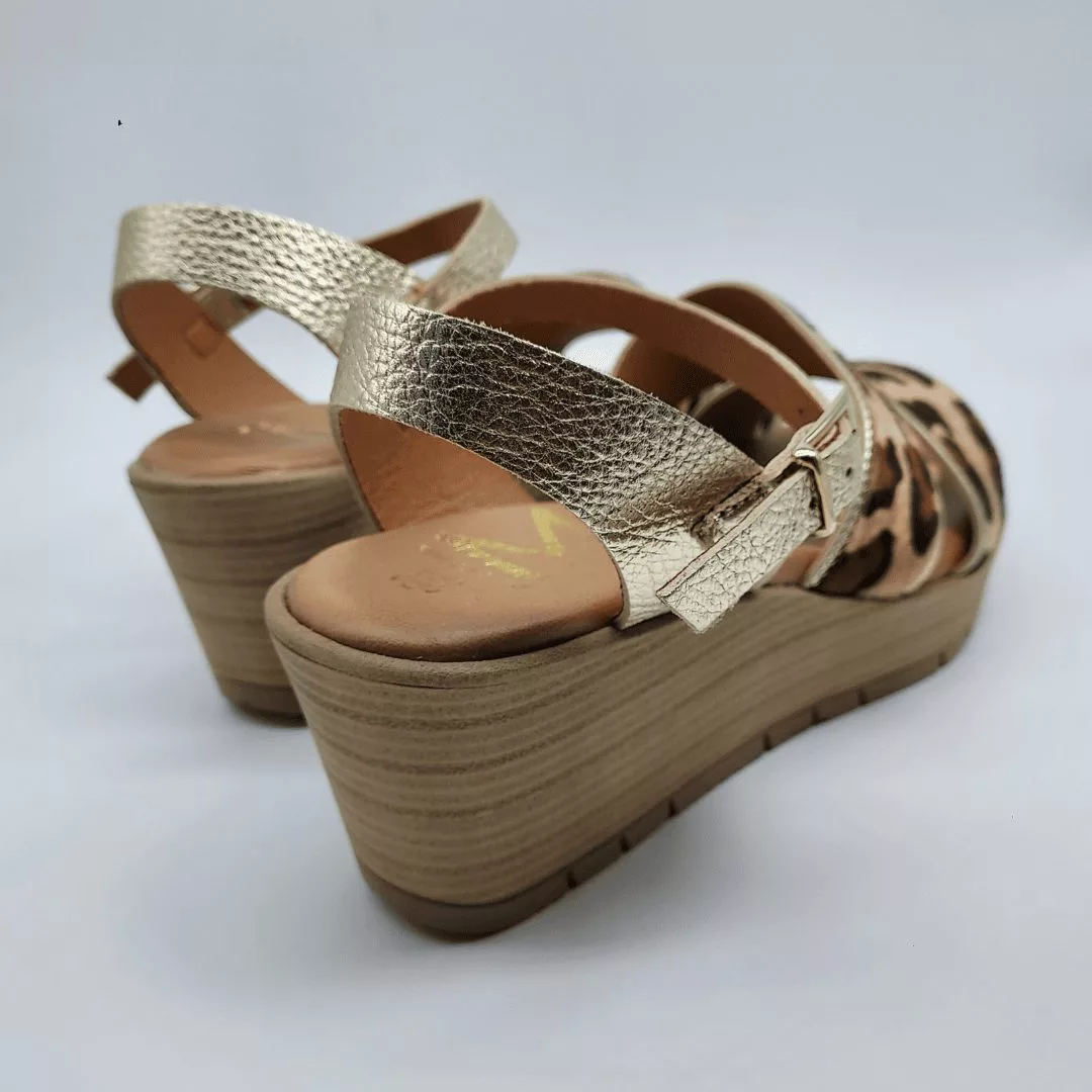 Molonas Mod. 961, Sandalia en Piel Grabada combinada con Animal Print acabado Carrara con Cuña de 6,5 cm. de altura y Plataforma de 1,5 cm., Plantilla Acolchada en Piel Ultra Confort y Cierre tipo Pulsera mediante Hebilla en el Tobillo. Hecha en España.