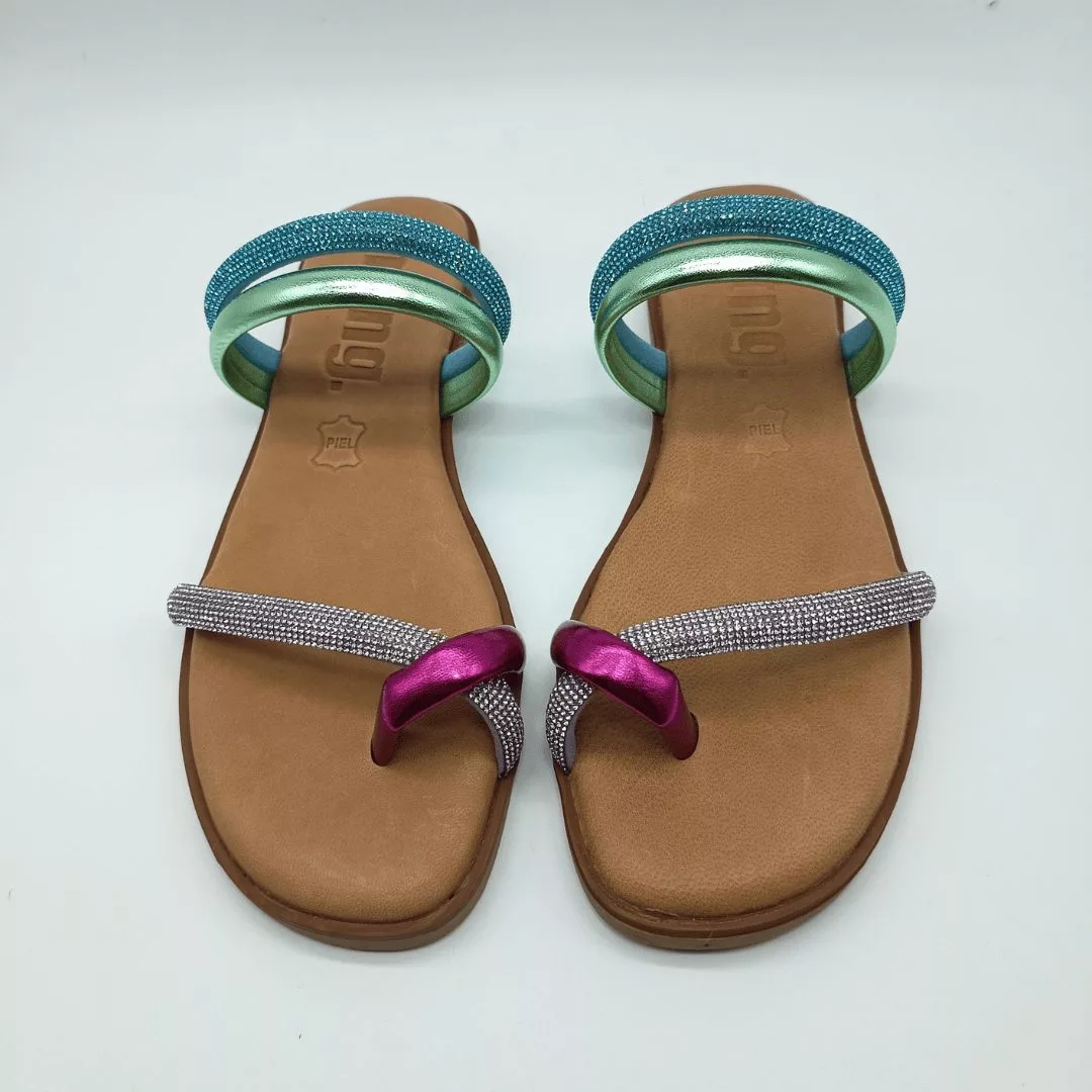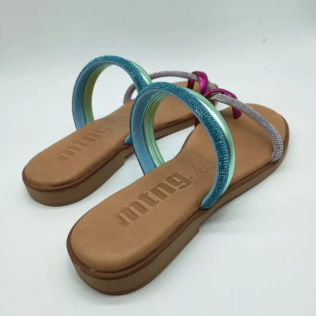Mustang Mod. 54563, Sandalia Plana de Ajuste Ceñido diseñada en color Malva combinada con Tiras de Pedrería en Fucsia, Verde Claro y Azul Claro. Plantilla en Piel y Suela de Goma con Tacón de 1 cm. Hecha en España.