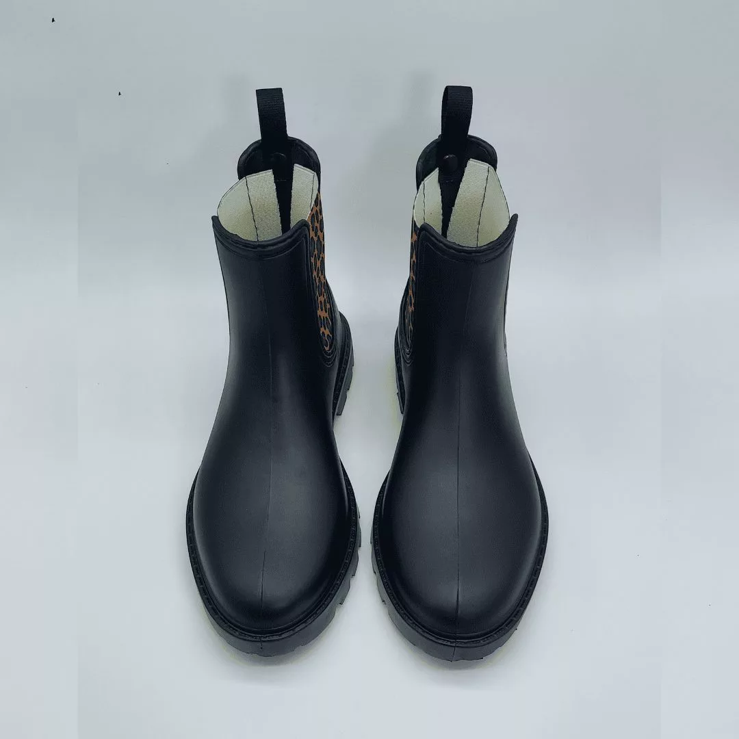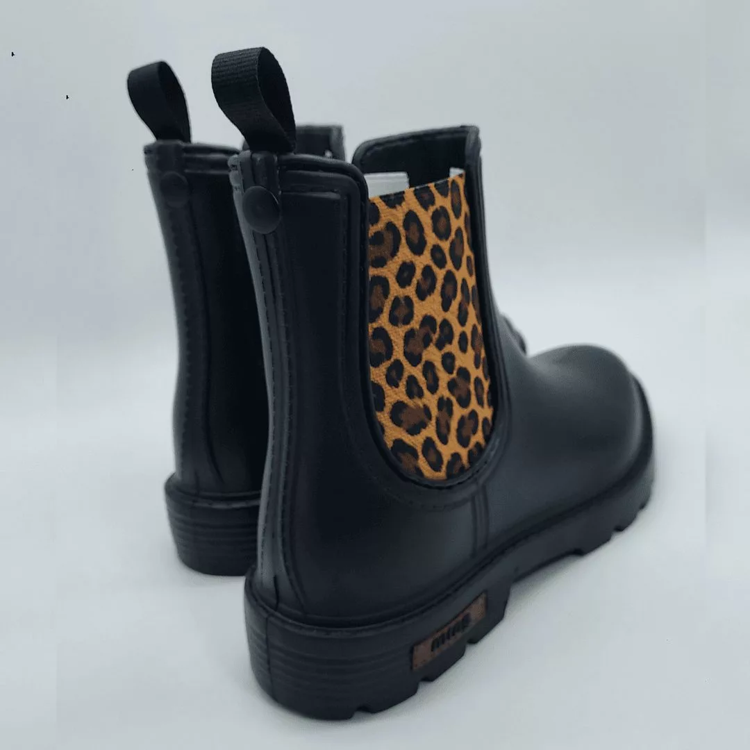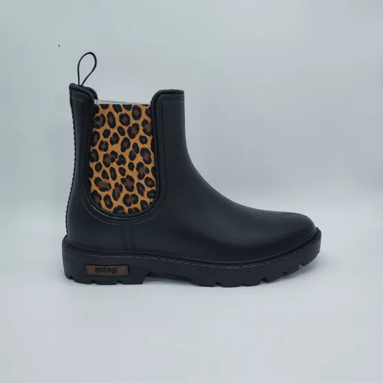 Mustang Mod. 56334, Bota de Agua tipo Chelsea modelo Halo Acabado color Negro con Paneles Laterales Elásticos estampados en Leopardo. Tacón de 3 cm. de altura y Plataforma de 1,5 cm. Hecha en España.