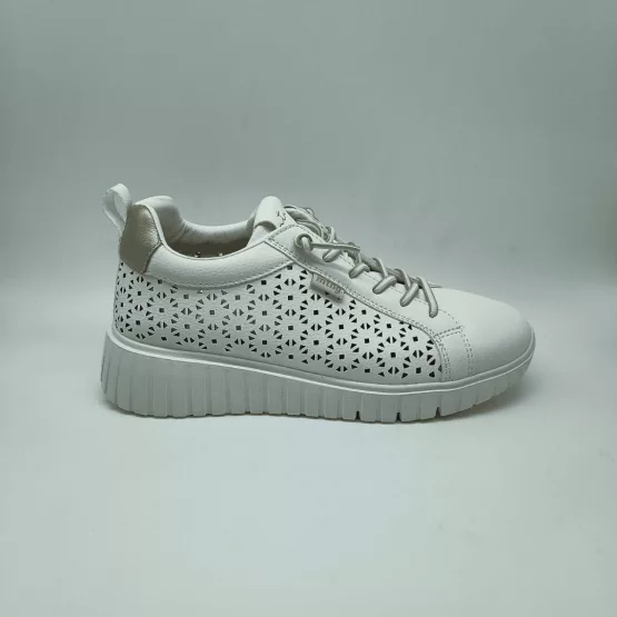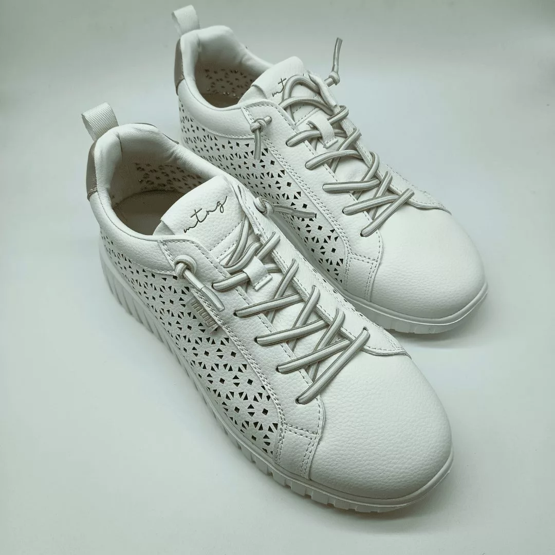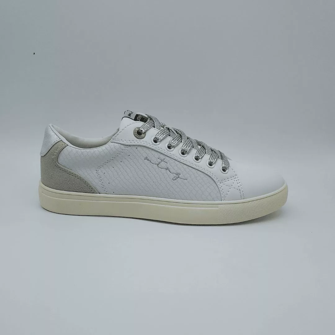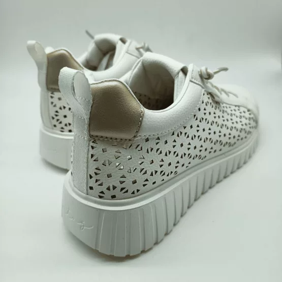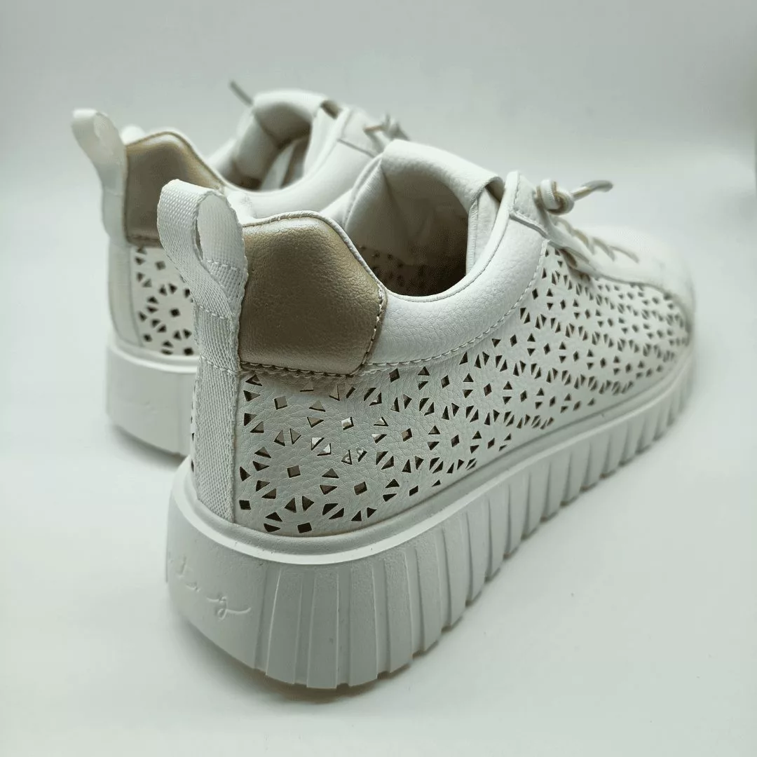 Mustang Mod. 60776, Zapatilla estilo Casual en Tejido Sintético Calado, Punta Redonda, Acabado Murri color Blanco combinado con detalles en Dorado, Cierre mediante Cordones Elásticos, Suela de Goma con Cuña de 3,5 cm.