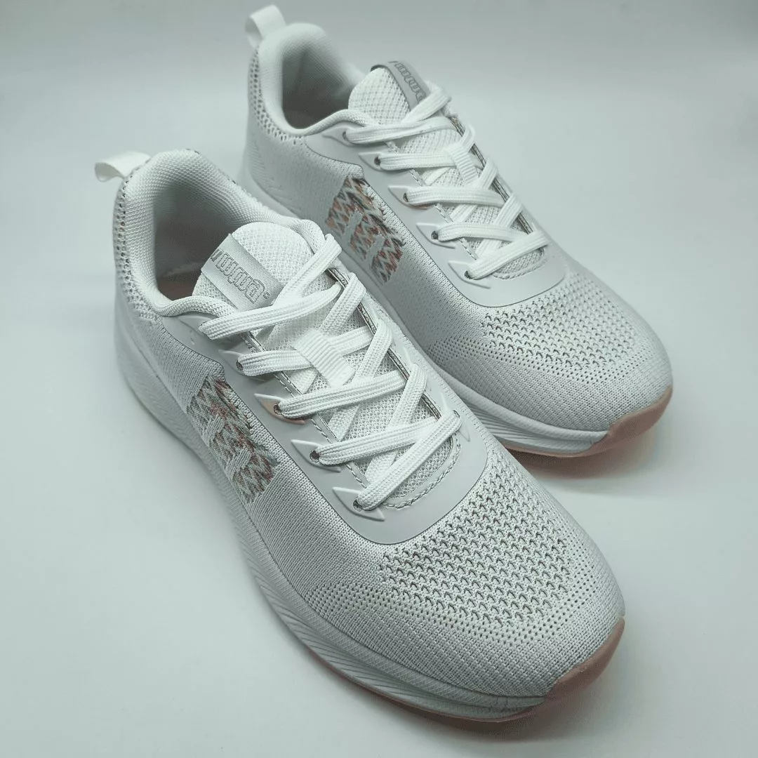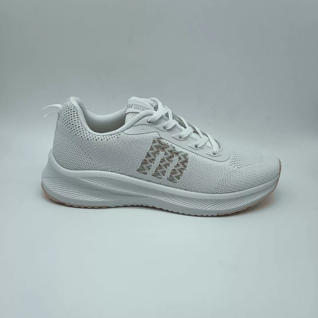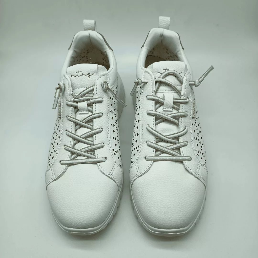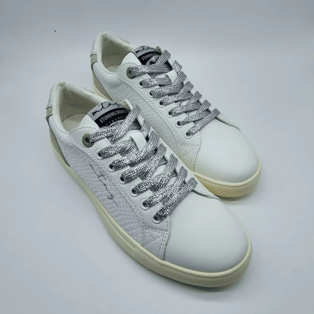 Mustang Mod. 60776, Zapatilla estilo Casual en Tejido Sintético Calado, Punta Redonda, Acabado Murri color Blanco combinado con detalles en Dorado, Cierre mediante Cordones Elásticos, Suela de Goma con Cuña de 3,5 cm.
