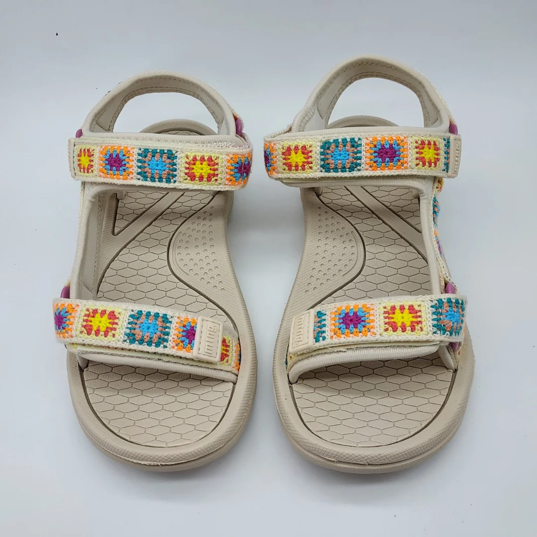 Mustang Mod. 60804, Sandalia tipo Sport modelo Solana en color Beige fabricada en textil estampado con Diseño Multicolor de Estilo Crochet. Cierre mediante Velcros Ajustables (2), planta y Suela de Goma en color Beige de 3 cm. Con certificado VEGANO sellado por INESCOP.