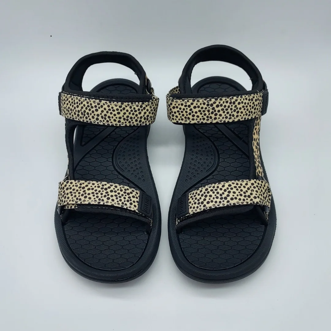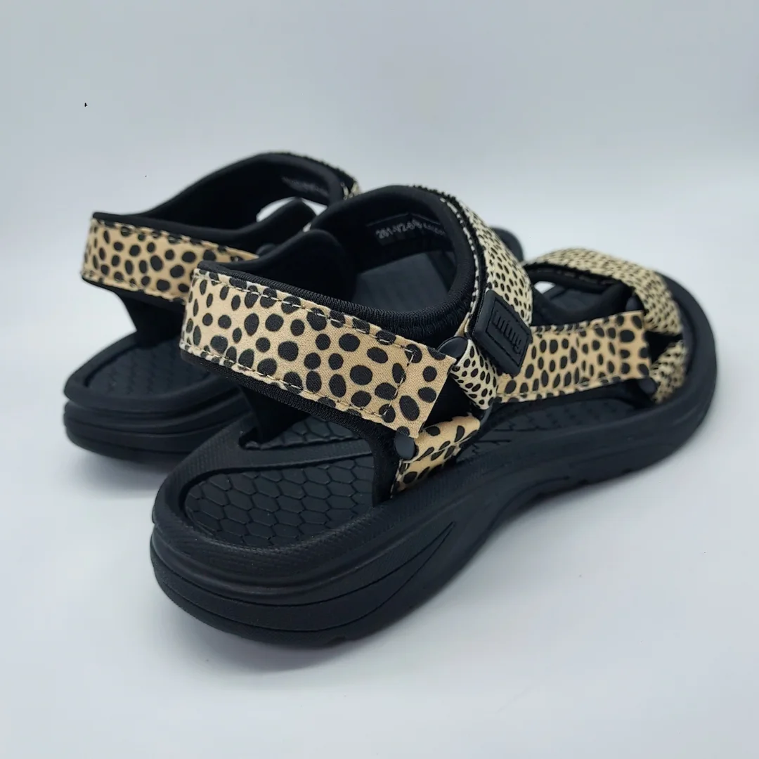 Mustang Mod. 60804, Sandalia tipo Sport modelo Solana en color Negro y Beige fabricada en textil estampado con Diseño en Animal Print. Cierre mediante Velcros Ajustables (2), planta y Suela de Goma en color Negro de 3 cm. Con certificado VEGANO sellado por INESCOP.