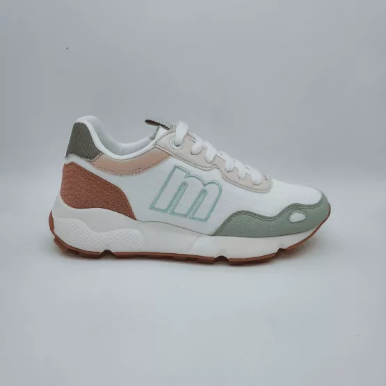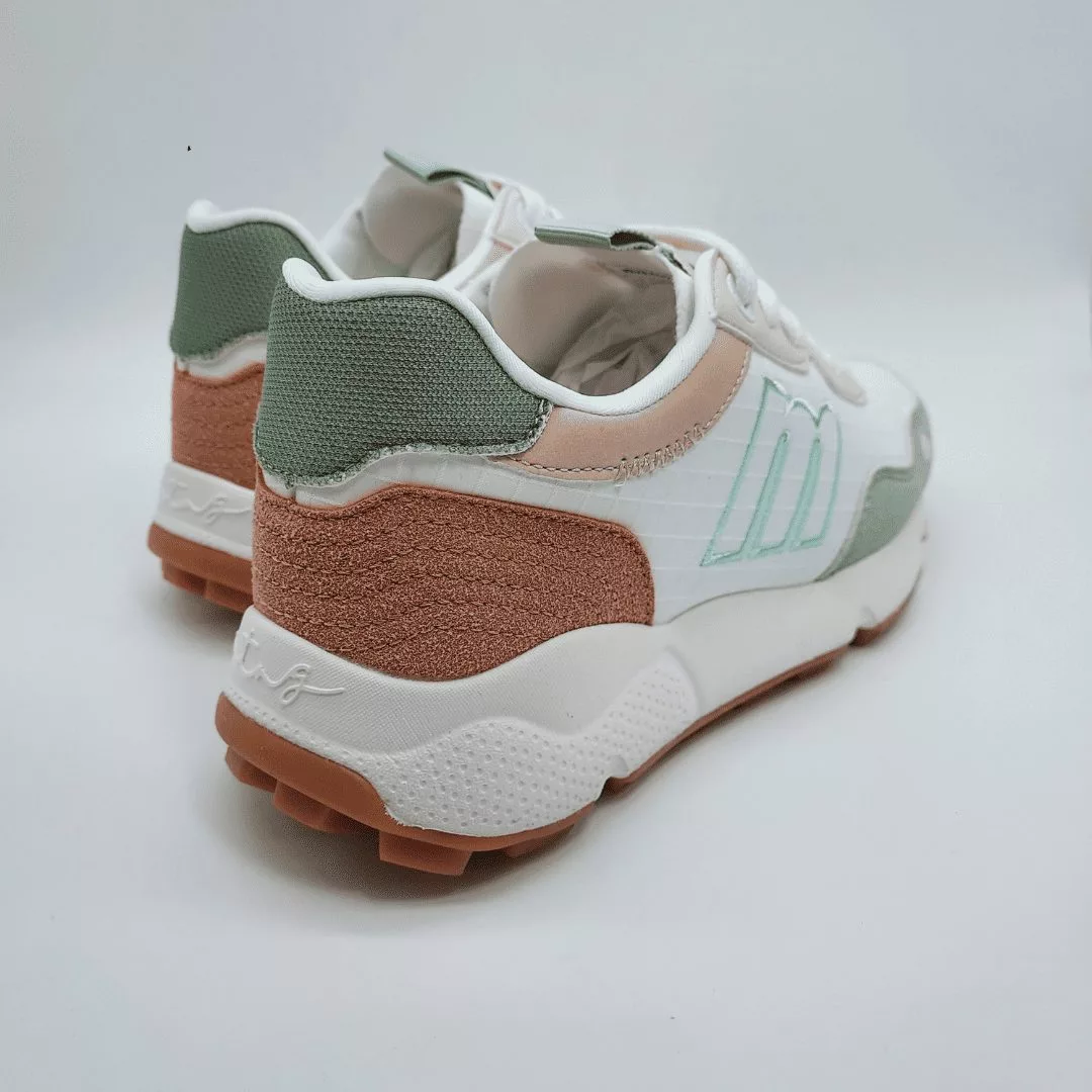 Mustang Mod. 60885, Deportivo Climb Acabado color Blanco con detalles en verde y rosa, Base Clara con paneles en tonos tierra y texturas contrastadas. Cierre mediante Cordones, Plantilla Extraíble con Tecnología Starfit, Suela Gruesa y Dentada Extralight. Con certificado VEGANO sellado por INESCOP.