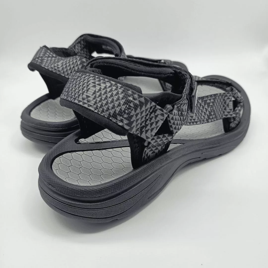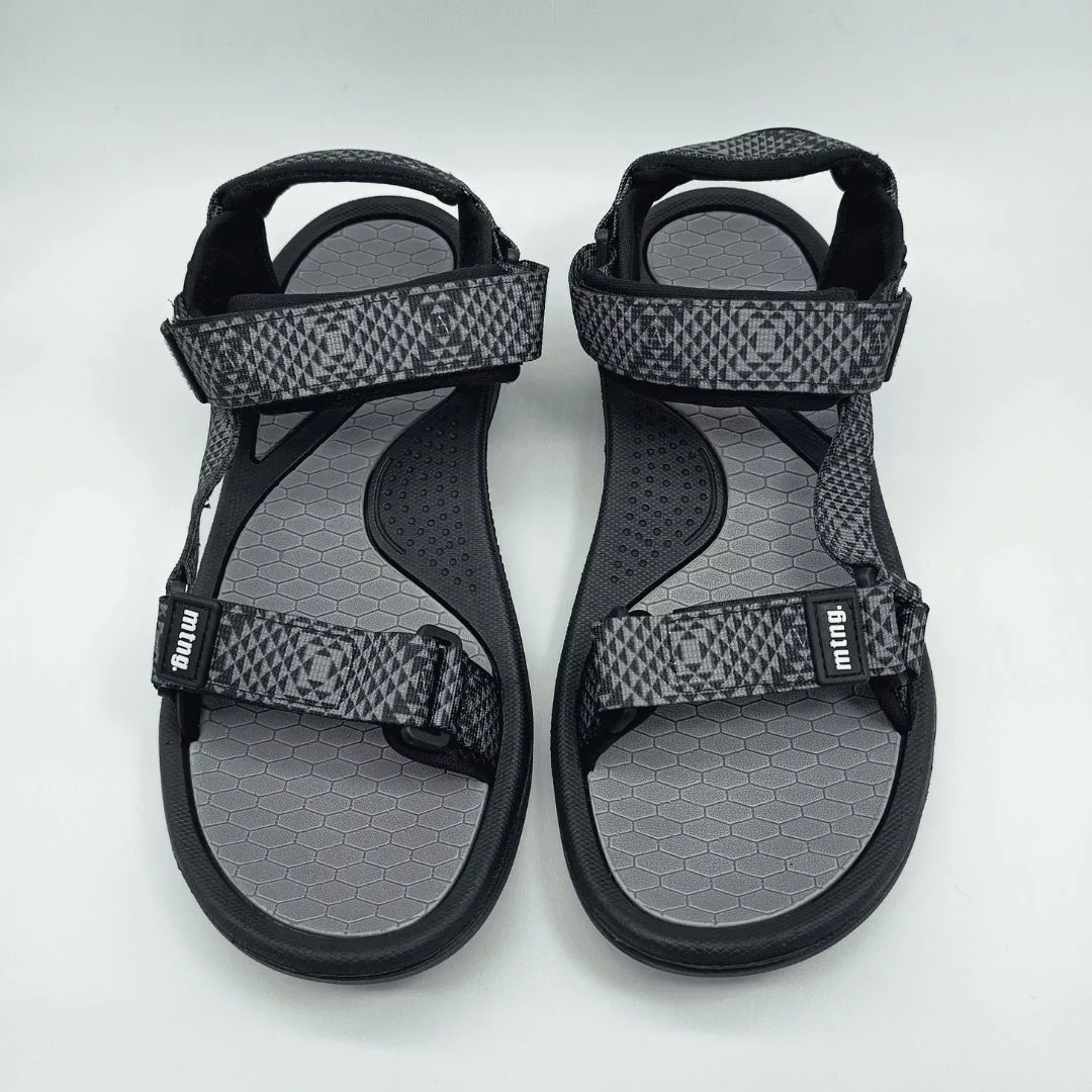 Mustang Mod. 84660, Sandalia estilo Casual fabricada en textil estampado con Diseño étnico en tonos Gris y Negro. Cierre mediante Velcros Ajustables (2), planta en color Gris y Suela de Goma en color Negro de 3 cm.