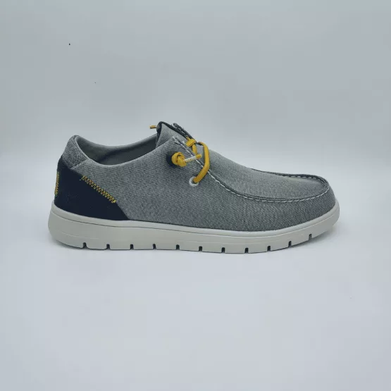 Mustang Mod. 84811, Zapato estilo Naútico en Tejido Textil, Acabado Denver color Gris con detalles de marca en Talonera y Lengueta, Cierre mediante Cordones Elásticos color Mostaza, Suela Blanca Dentada Extralight, Plantilla Extraible Starfit acolchada.