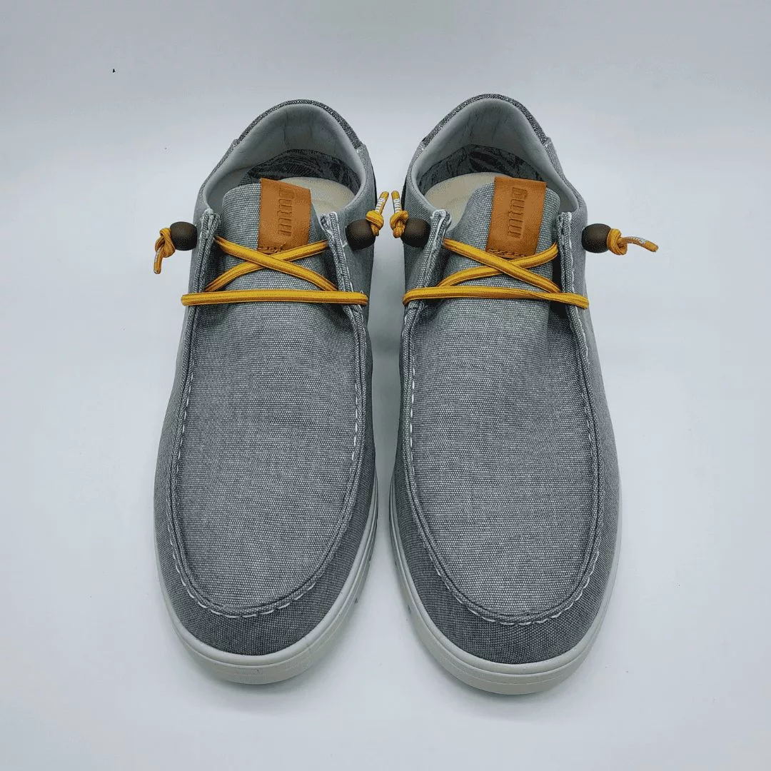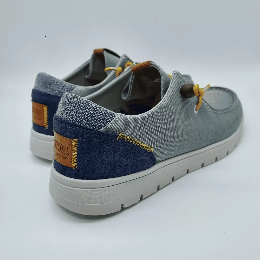Mustang Mod. 84811, Zapato estilo Naútico en Tejido Textil, Acabado Denver color Gris con detalles de marca en Talonera y Lengueta, Cierre mediante Cordones Elásticos color Mostaza, Suela Blanca Dentada Extralight, Plantilla Extraible Starfit acolchada.