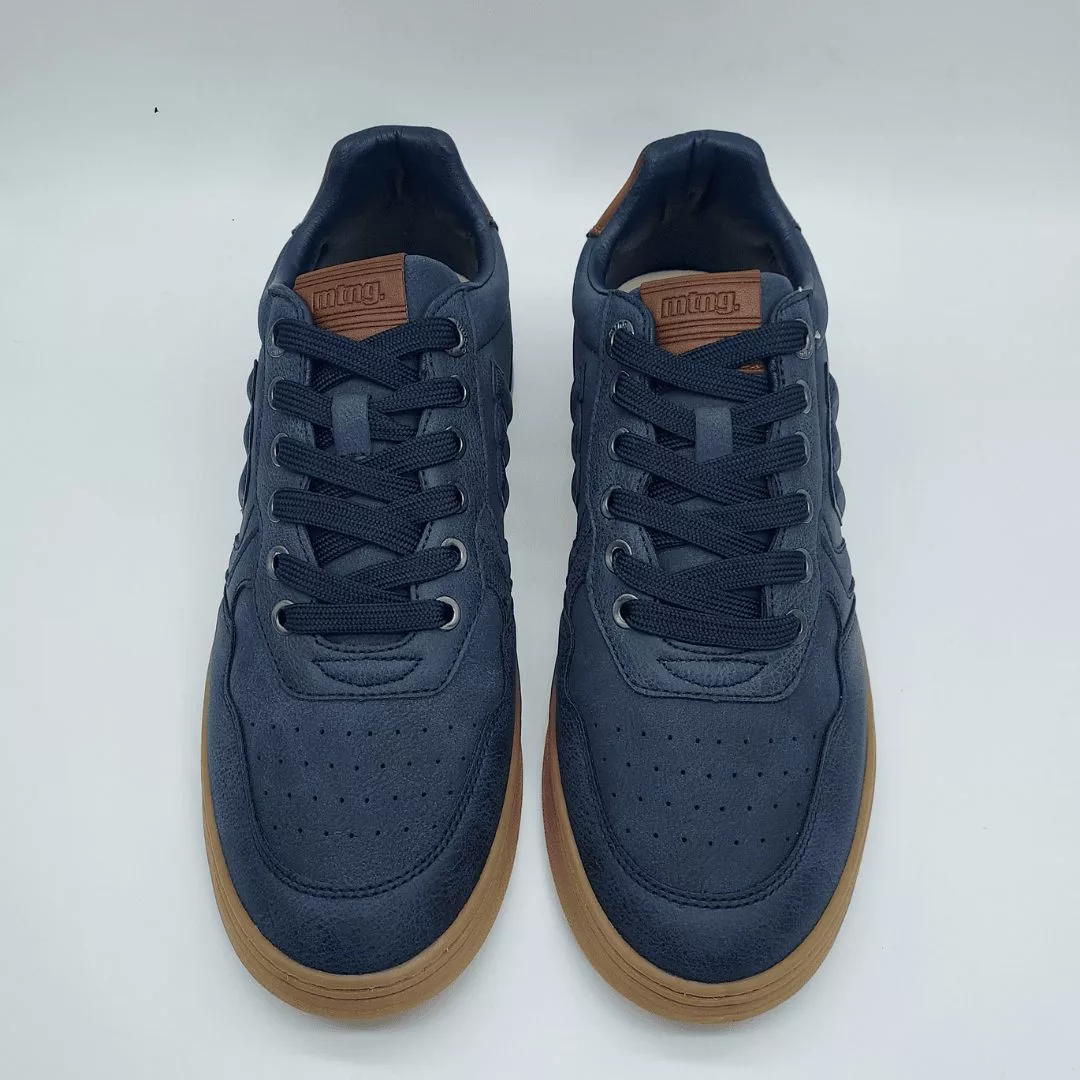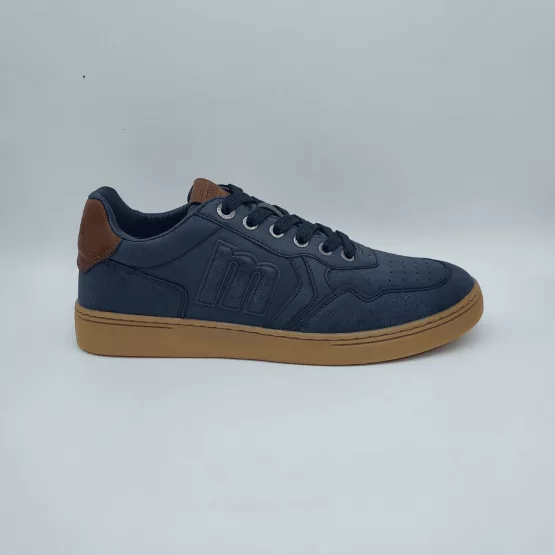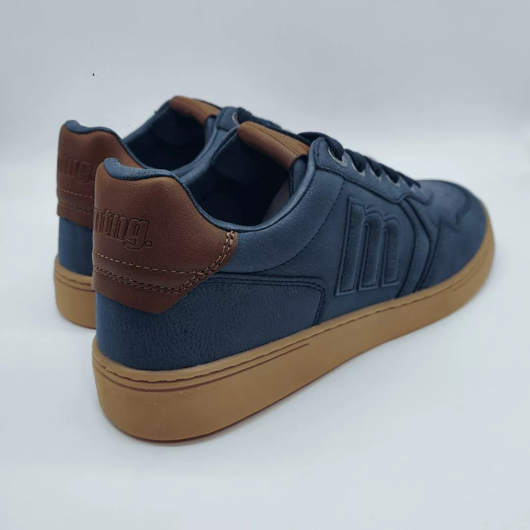 Mustang Mod. 84823, Zapatilla Deportiva Miami acabado color Marino con detalles en Moka en el talón y lengüeta, Cierre mediante Cordones Planos en Marino, logo en relieve lateral y con pespuntes decorativos, Plantilla de 4 mm con tecnología Starfit con espuma Comfort Foam, Suela de Goma en tono Caramelo.