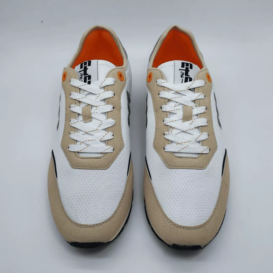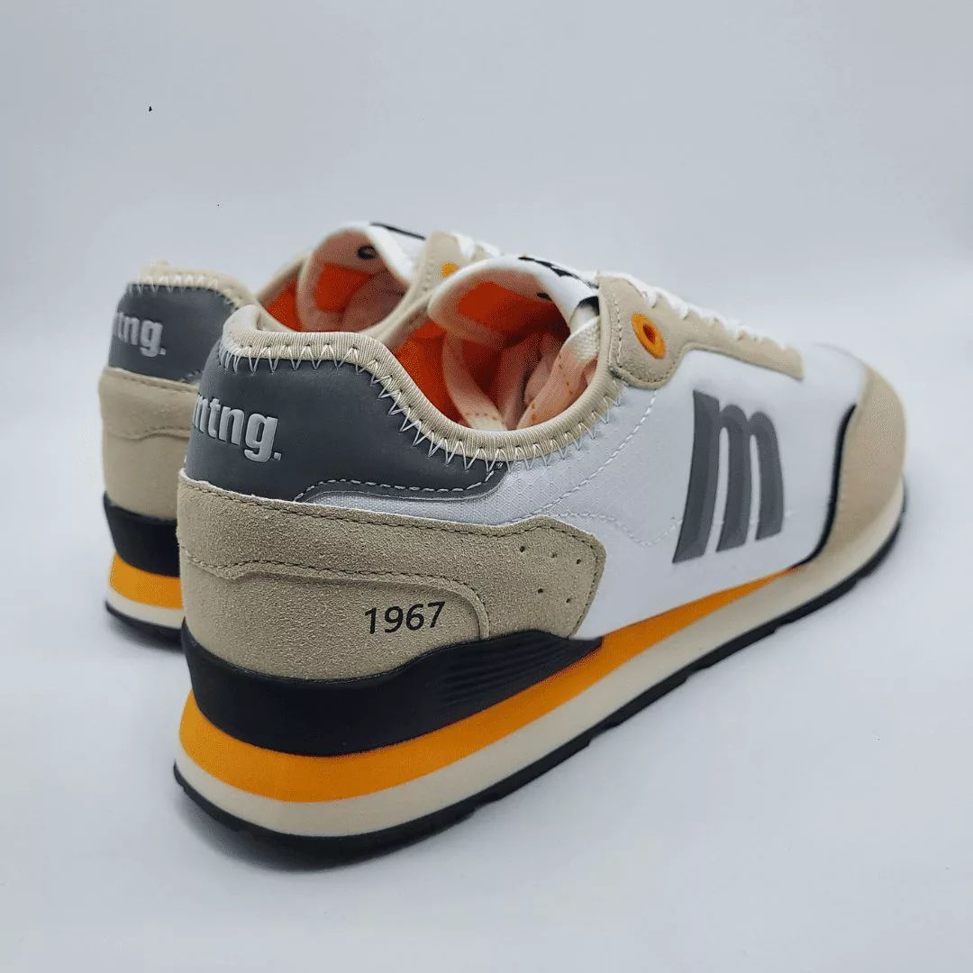 Mustang Mod. 84859, Deportivo Joggo Classic acabado color Blanco con detalles en Beige, Gris y Naranja , Cierre mediante Cordones Planos color Blanco, Paneles de texturas suaves y el logotipo lateral en relieve, Plantilla de 4 mm con tecnología Starfit con espuma Comfort Foam, Suela Plana Bicolor Dentada. Con certificado VEGANO sellado por INESCOP.