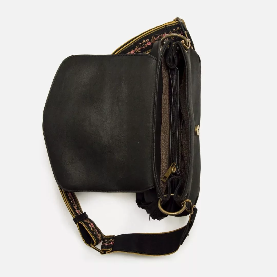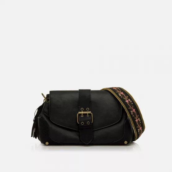Mustang Mod. C58846, Bolso tipo Bandolera para Mujer Acabado Sac color Negro fabricado en materiales sintéticos combinados con textiles, con solapa que se cierra mediante correa central y hebilla decorativa dorada con acabado de botón imantado, detalles de textura en los laterales y flecos en el lateral. Bandolera ancha con bordado floral en tonos rosados y dorados. Incluye compartimentos interiores con cierre de cremallera.