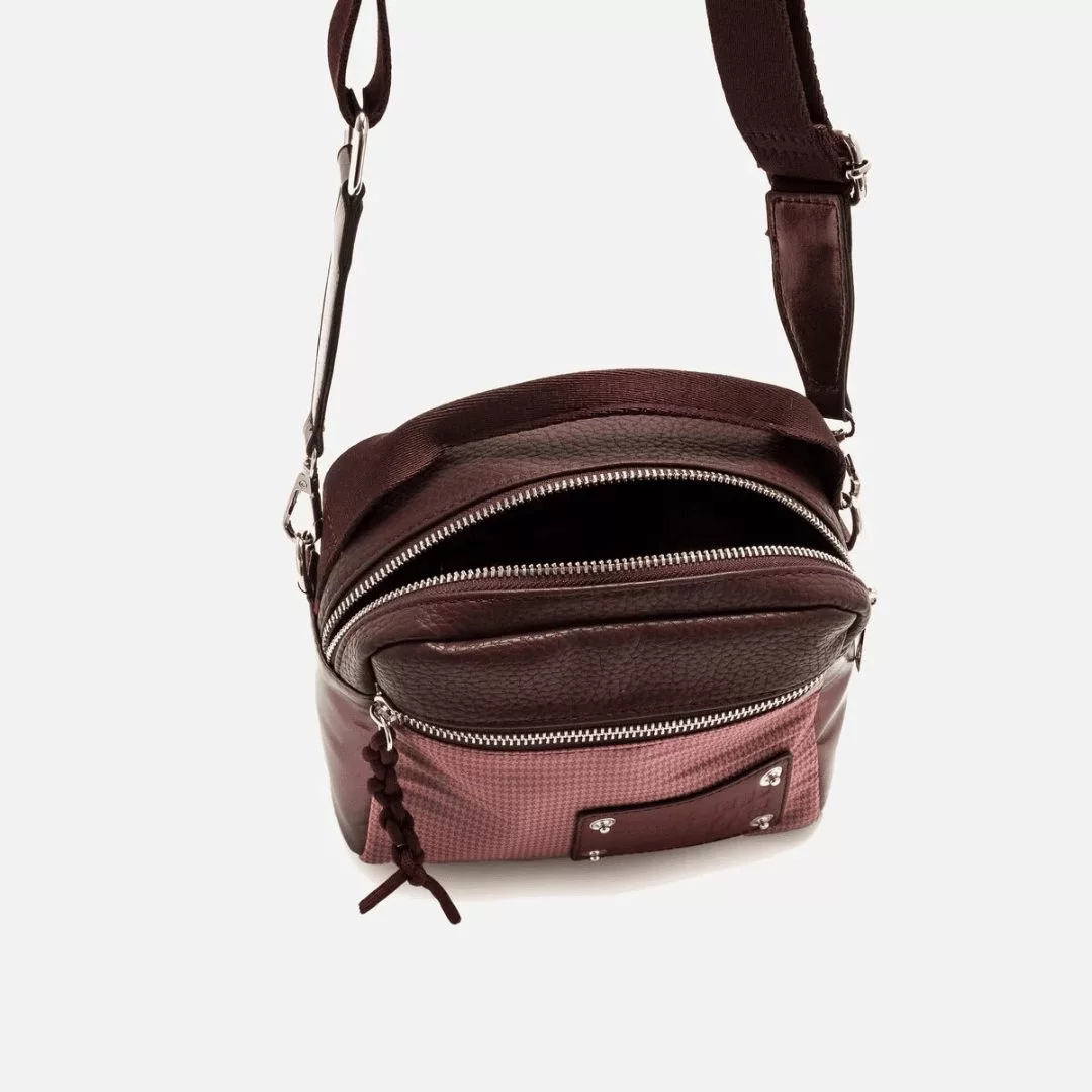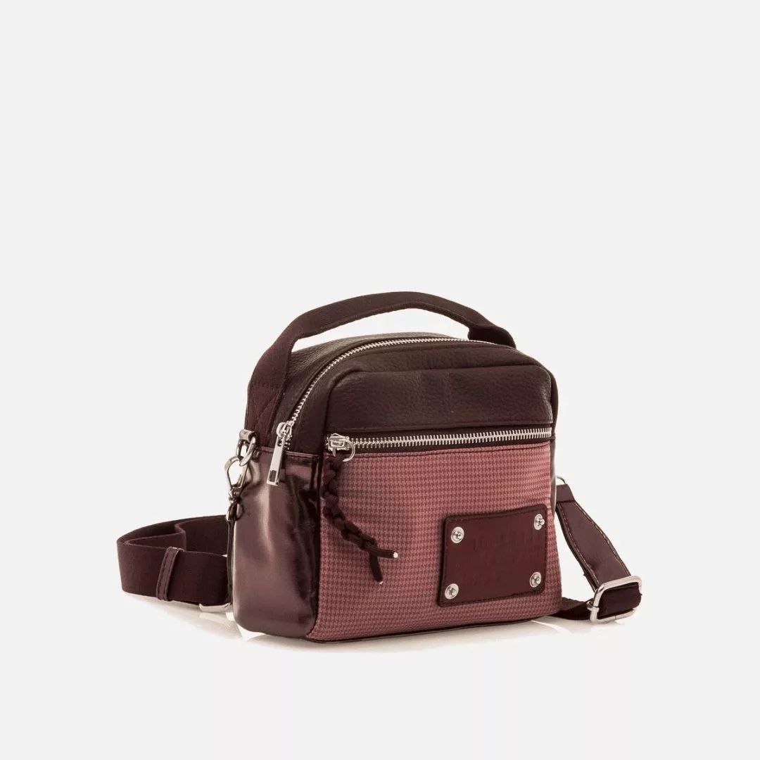 Mustang Mod. C58989, Banderola Casual para Mujer con formato compacto y estructura cuadrada, Acabado CURA color Burdeos combina texturas y acabados en tonos burdeos y rosa, con detalles metalizados y un panel frontal estampado con bolsillo. Con doble asa, una de mano y una correa ajustable para mayor versatilidad.