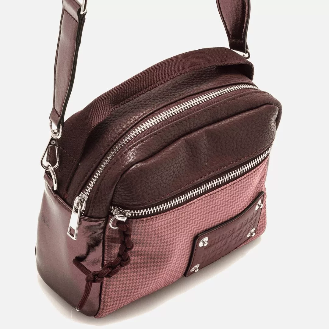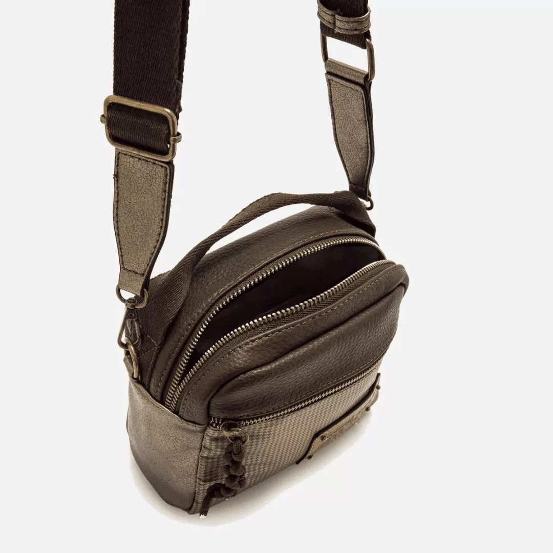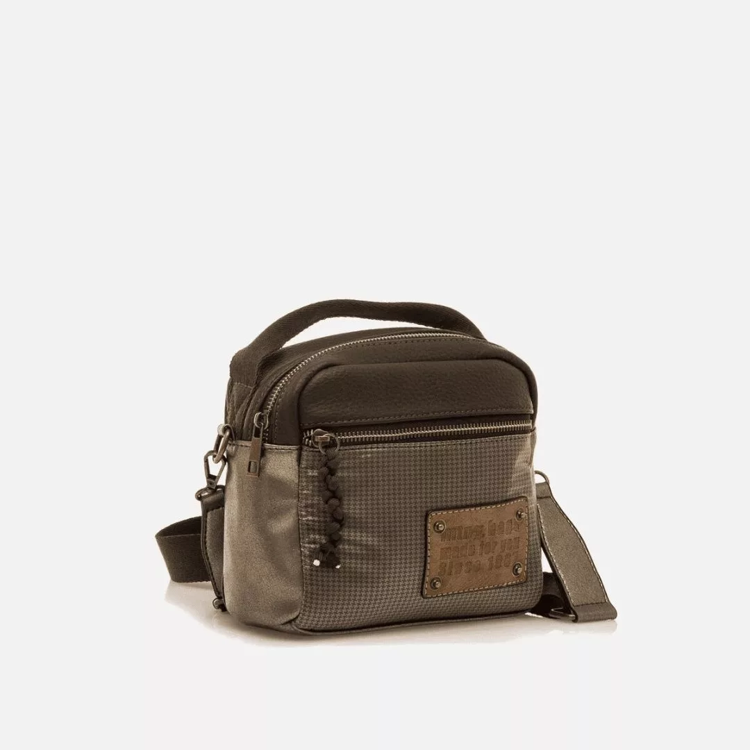 Mustang Mod. C58991, Banderola Casual para Mujer con formato compacto y estructura cuadrada, Acabado CURA color Moka combina texturas y acabados en tonos champagne y marrón, con detalles metalizados y un panel frontal estampado con bolsillo. Con doble asa, una de mano y una correa ajustable para mayor versatilidad.