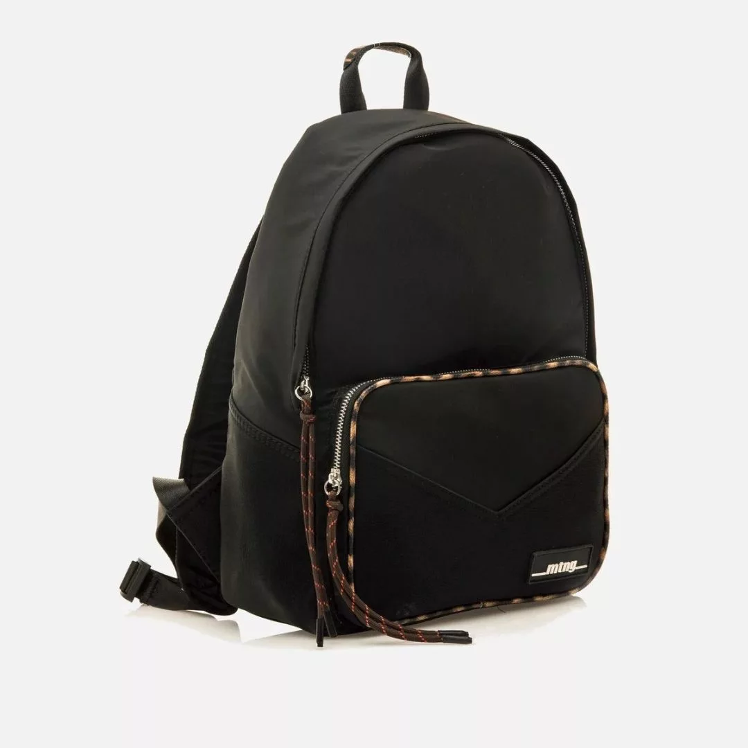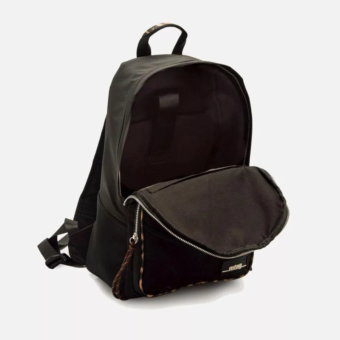 Mustang Mod. C59000, Mochila para Mujer Acabado ALELI color Negro fabricada con materiales sintéticos y textiles, bolsillo frontal con bordes de estampado animal print y cierre de cremallera con cordones, compartimento principal con cierre de cremallera, incluye bolsillo con cinta elástica ideal para dispositivos. Con asas acolchadas y ajustables.