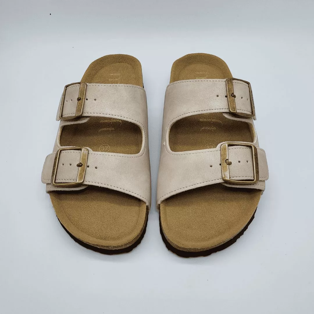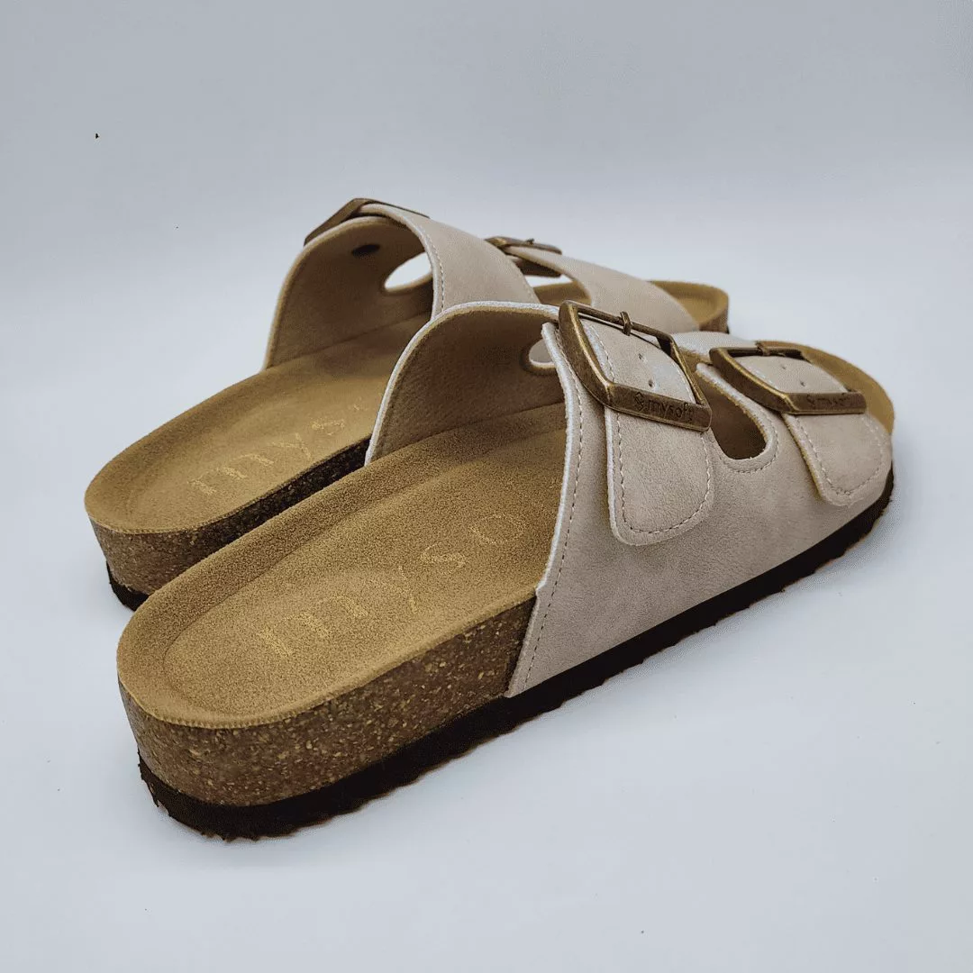 Mysoft Mod. 25M075, Sandalia Plana tipo BIO fabricada con Materiales Veganos (textil y sintético) acabado color Arena, con Cierre de Hebillas Ajustables (2). Plantilla SoftGel.