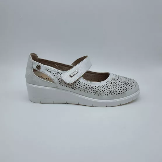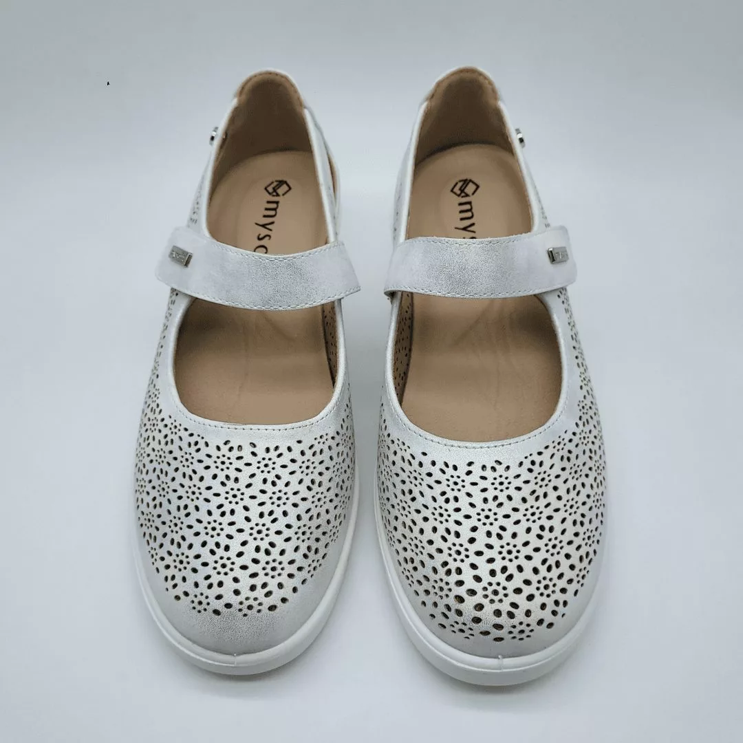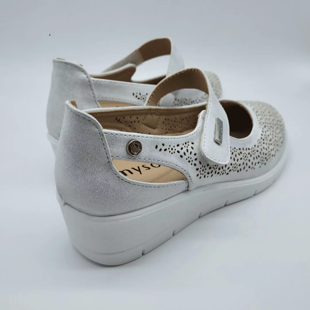 Mysoft Mod. 25M208, Merceditas en tejido ligero, flexible y transpirable, acabado color Plata con 2 aberturas en el talón, Cierre mediante Velcro Ancho. Suela de goma ligera y flexible de cuña de cuatro centímetros traseros. Plantilla SoftGel Extraible con Memory Foam.