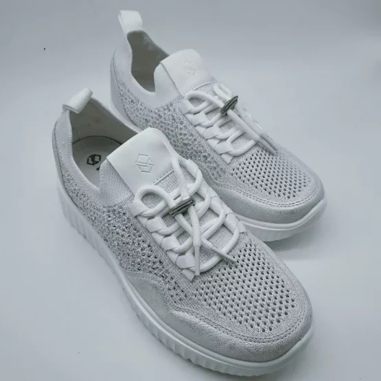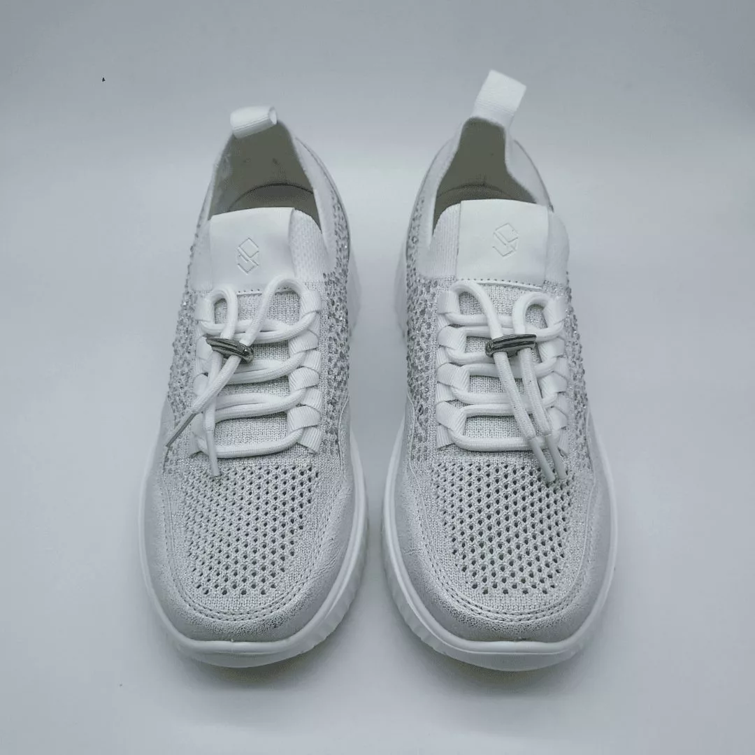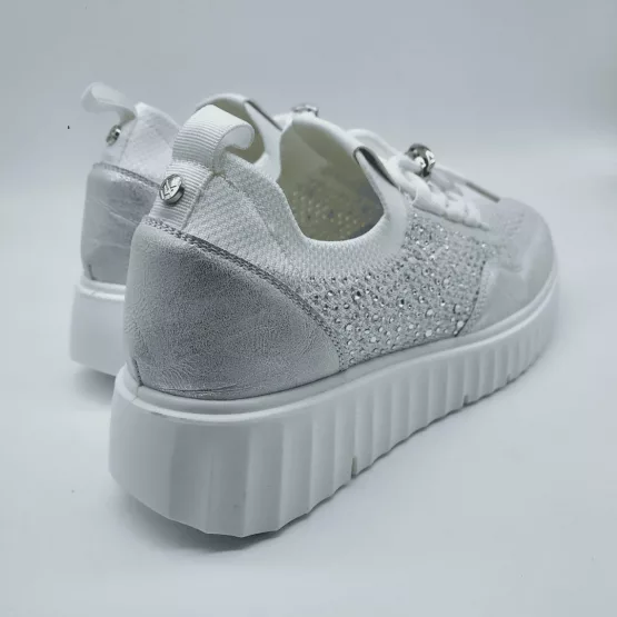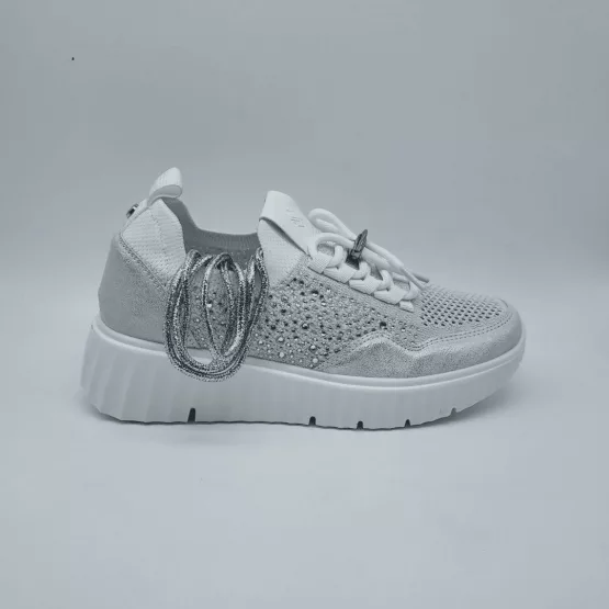 Mysoft Mod. 25M247, Sneaker Deportivo en tejido ligero y calado, acabado color Blanco combinado con detalles de cristales tipo Swarovski. Cierre mediante Cordones elásticos y tradicionales redondos al tono. Suela de goma ligera y flexible de cuña de 4,5 cm. y plataforma de 1 cm. Plantilla SoftGel Extraible con Memory Foam.
