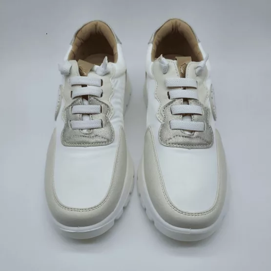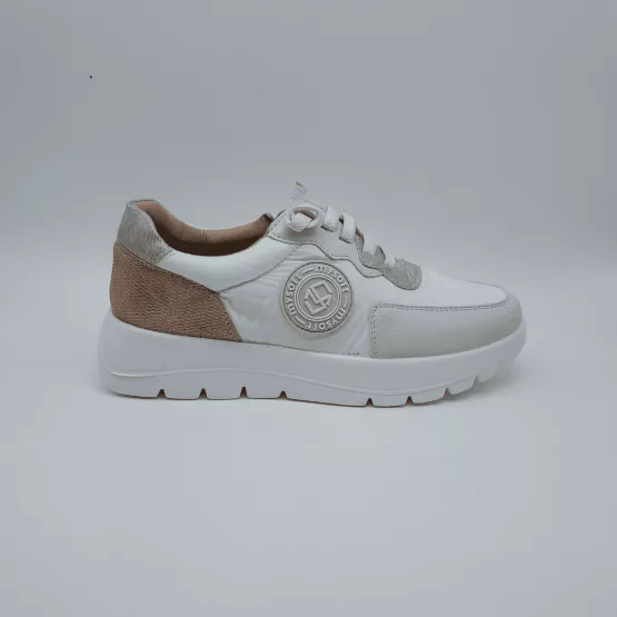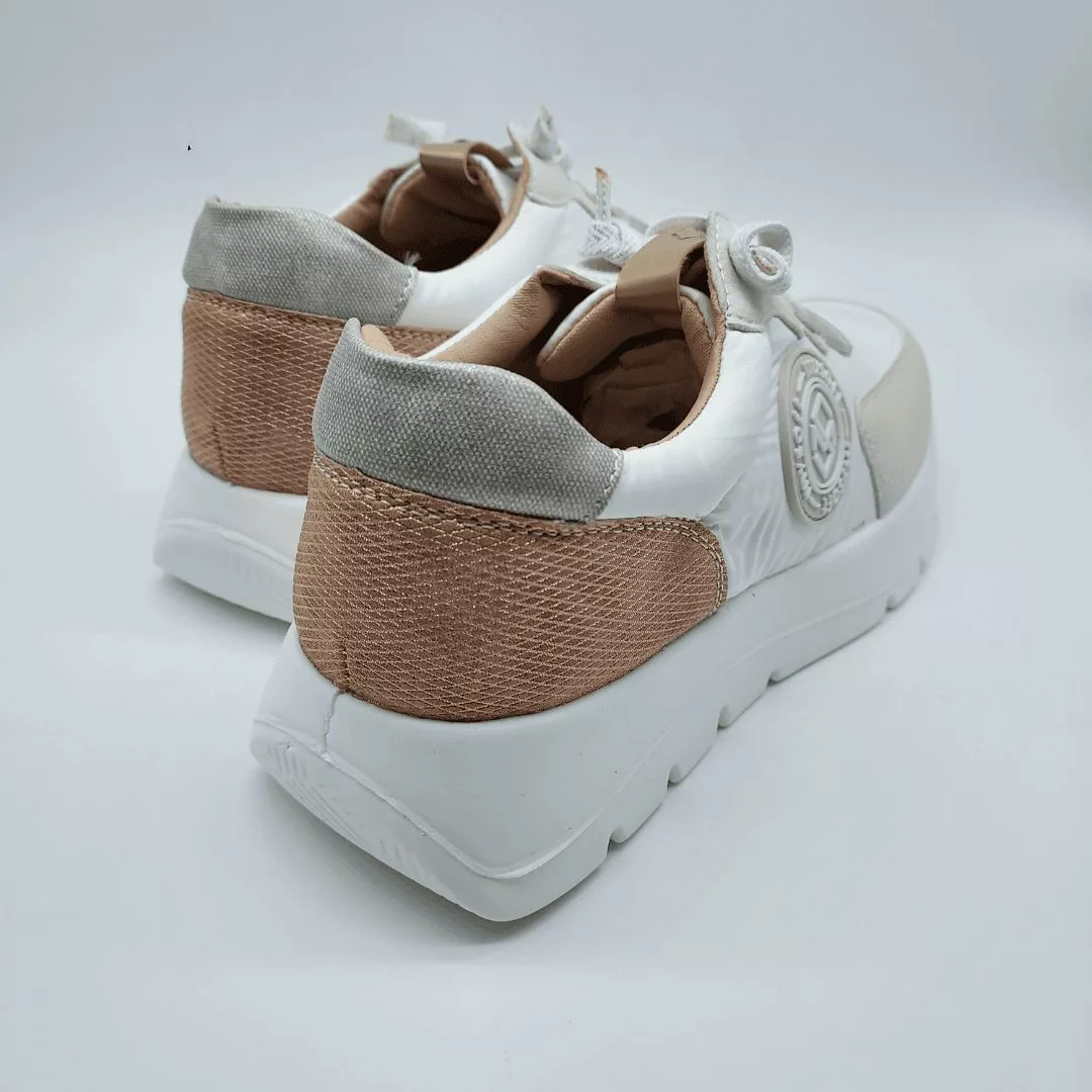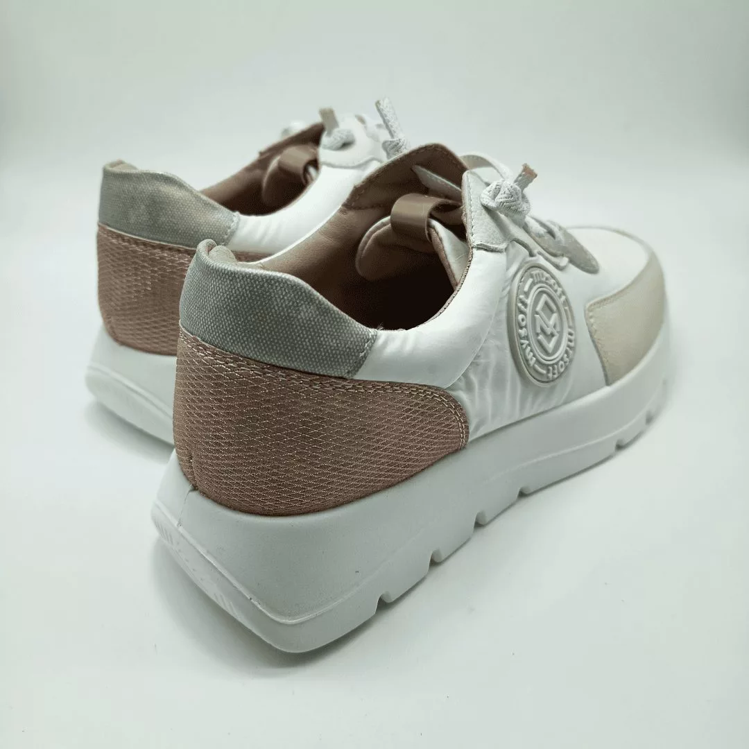 Mysoft Mod. 25M267, Sneaker Deportivo en tejido ligero y flexible, acabado color Blanco combinado con detalles Salmón y Grises. Cierre mediante Cordones elásticos. Suela de goma ligera y flexible de cuña de 3,5 cm. y plataforma de 1 cm. Plantilla SoftGel Extraible con Memory Foam.