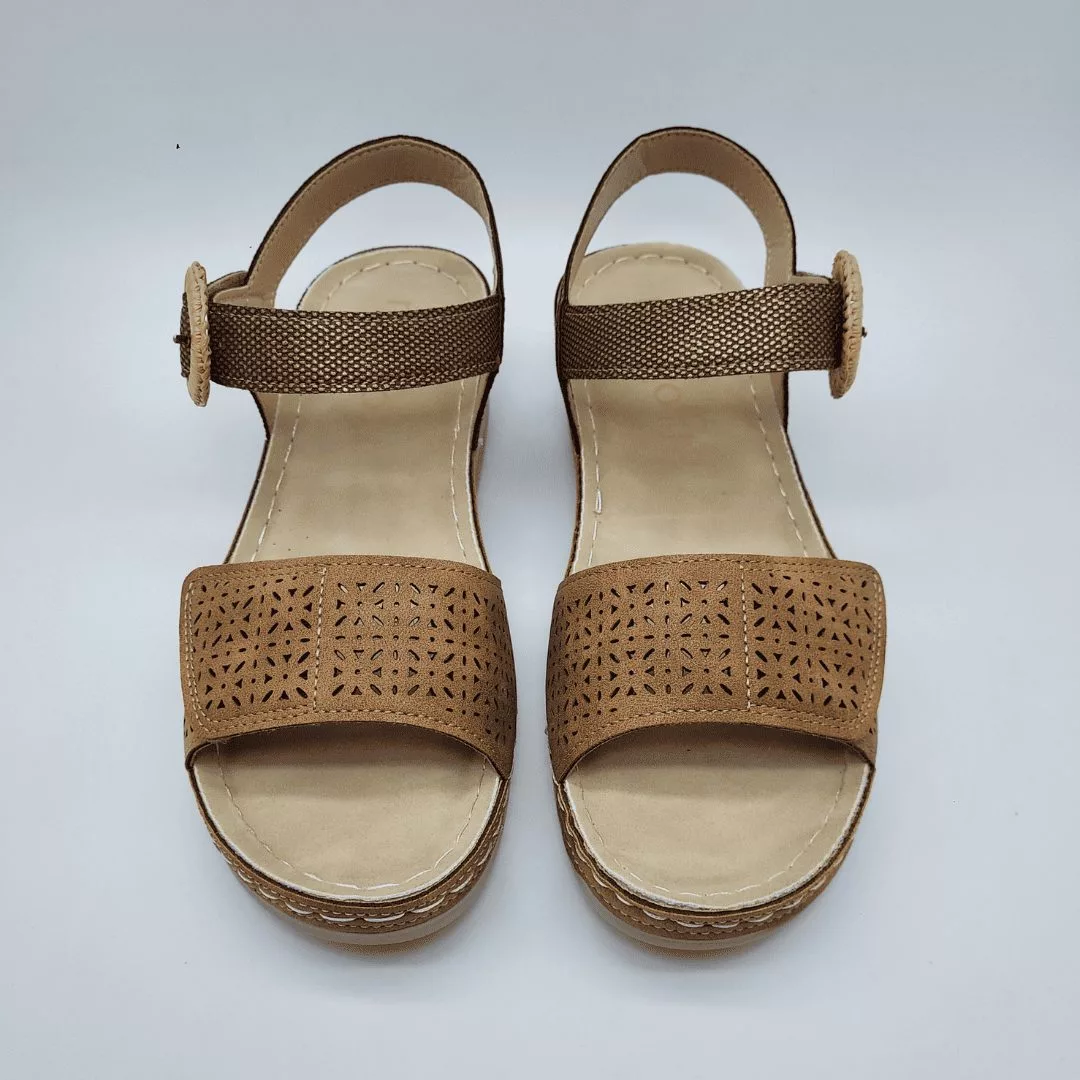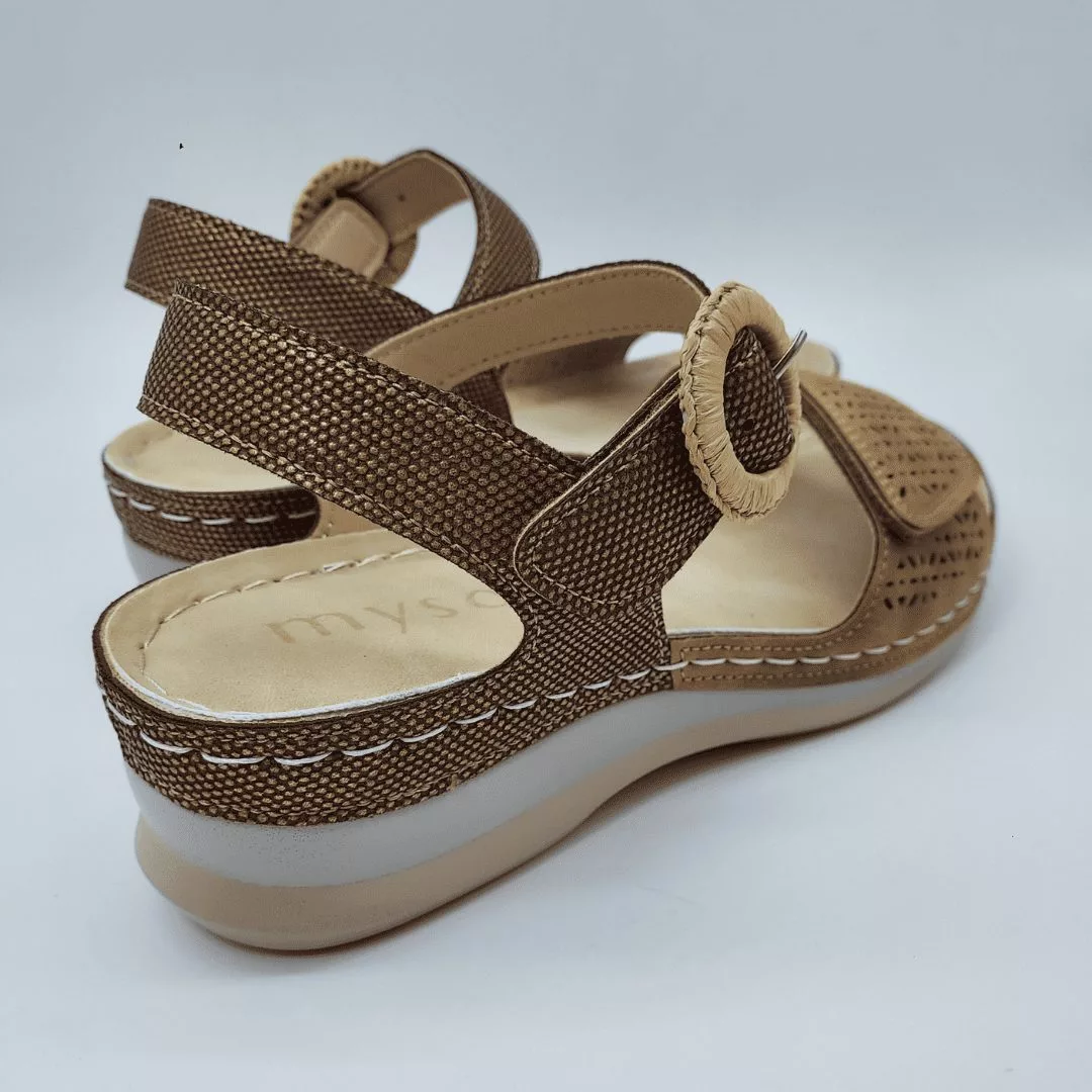 Mysoft Mod. 26M011, Sandalia con Cuña fabricada en Tejido Fantasía acabado Cuero, Cierre mediante Velcro (2) con detalle de Hebilla, con Cuña de 4,5 cm de altura y Plataforma de 1 cm. Plantilla Comfort Step System y Suela de Goma Antideslizante.