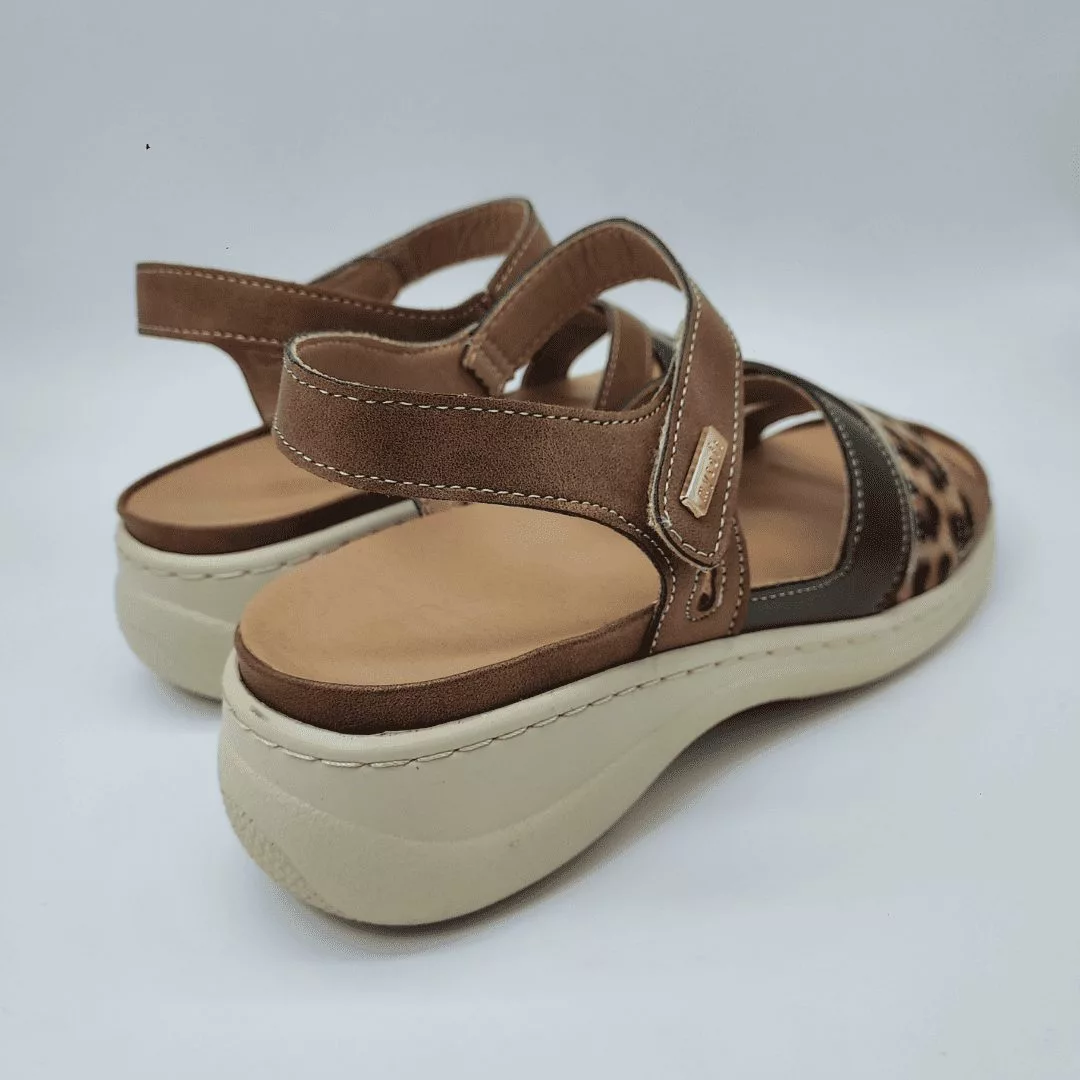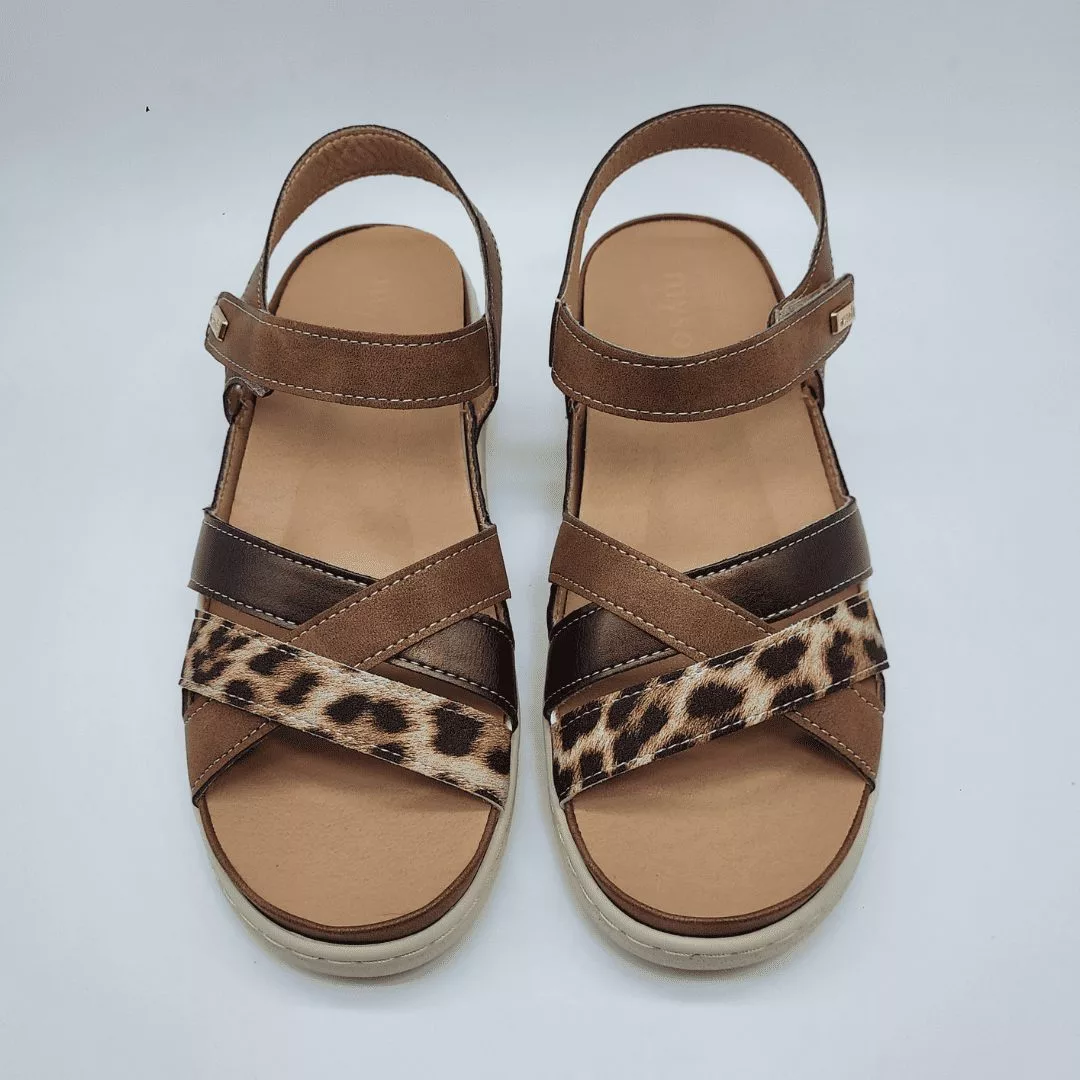 Mysoft Mod. 26M044, Sandalia de Tiras Cruzadas con Cuña fabricada en Tejido Fantasía acabado Cuero, Cierre mediante Velcro. Cuña de 4,5 cm de altura y Plataforma de 1 cm. Plantilla Extraible.