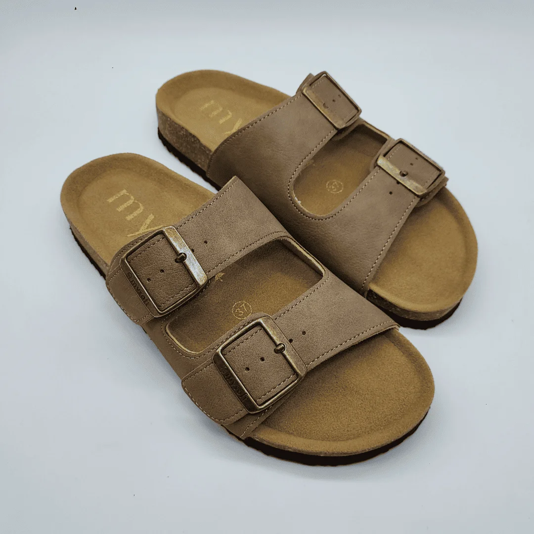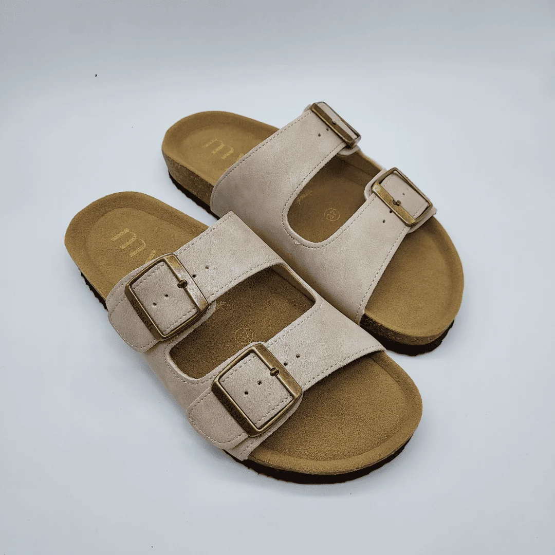 Mysoft Mod. 26M063, Sandalia con Cuña tipo BIO fabricada con Materiales Veganos (textil y sintético) acabado color Natural, con Detalle de Tachas y Cierre de Hebilla Ajustable. Altura de Cuña 3 cm. Suela de Goma Antideslizante.